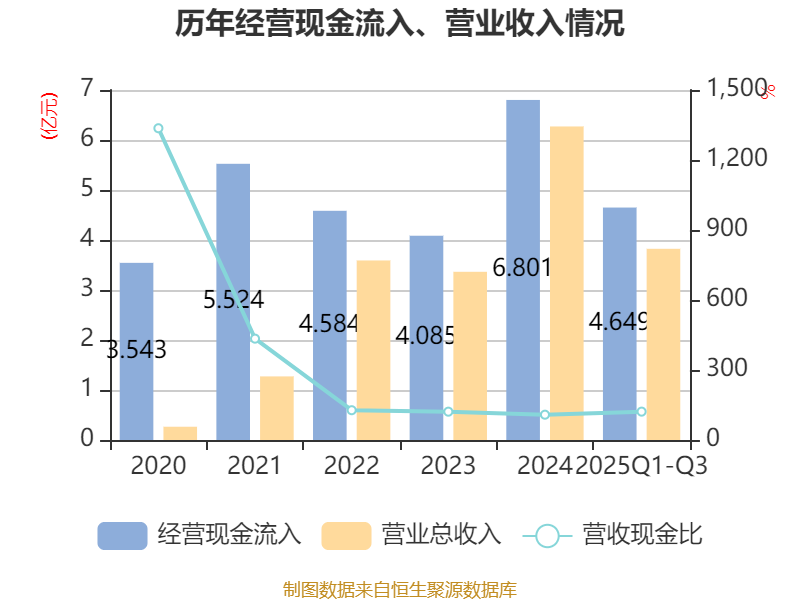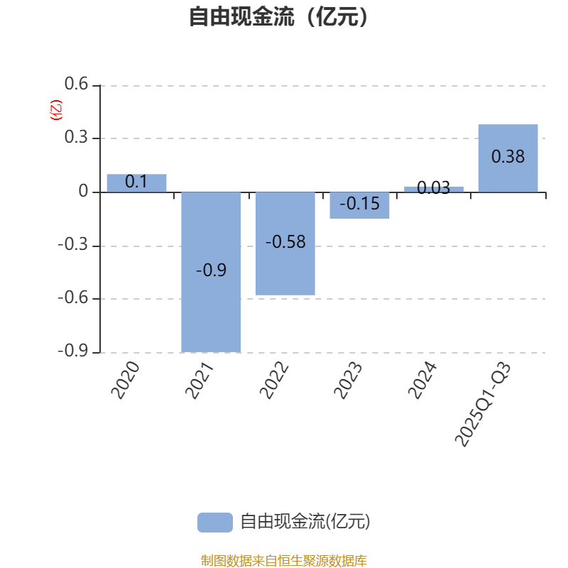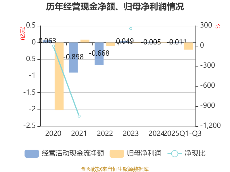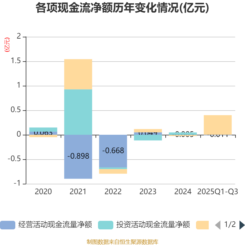 2025年前三季度,公司经营活动现金流净额为-107.39万元,同比减少1608.33万元;筹资活动现金流净额4004.54万元,同比增加4113.98万元;投资活动现金流净额0元,上年同期为-1021.03万元。