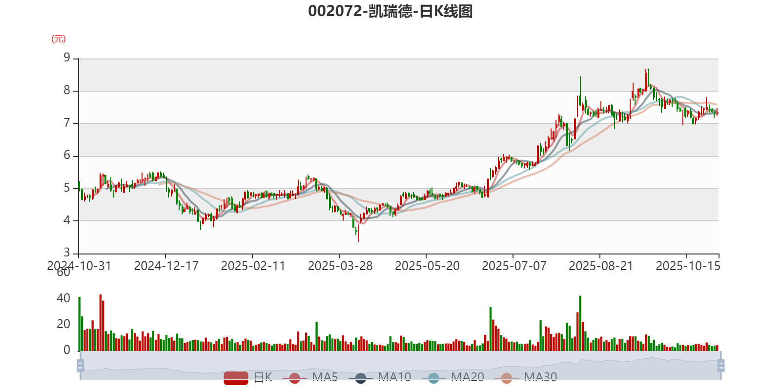 中证智能财讯凯瑞德(002072)10月31日披露2025年第三季度报告。前三季度公司实现营业总收入3.82亿元,同比下降23.78%;归母净利润亏损2112.77万元,上年同期亏损253.31万元;扣非净利润亏损1307.51万元,上年同期亏损279.96万元;经营活动产生的现金流量净额为-107.39万元,上年同期为1500.94万元;报告期内,凯瑞德基本每股收益为-0.0575元,加权平均净资产收益率为-51.70%。