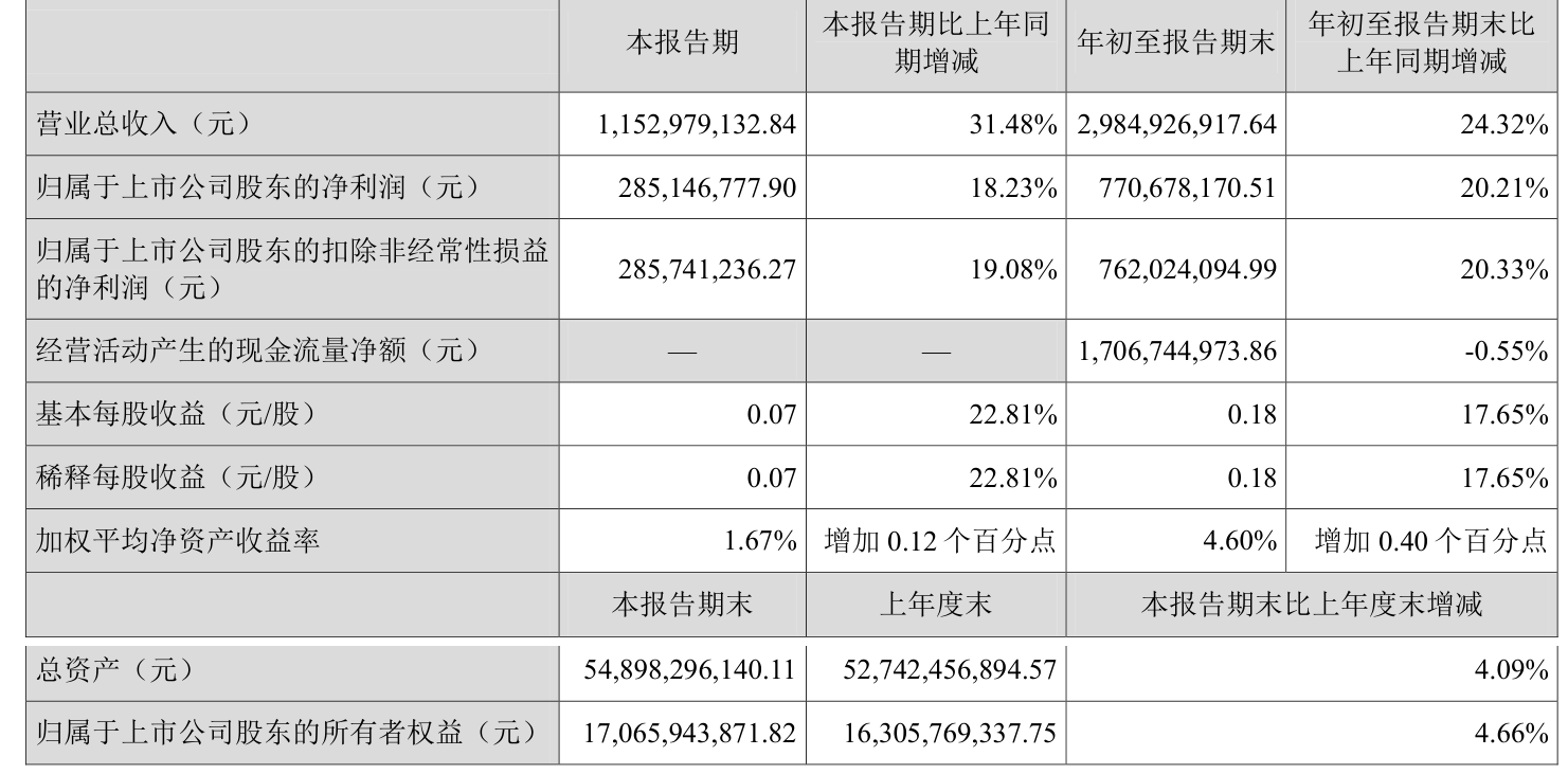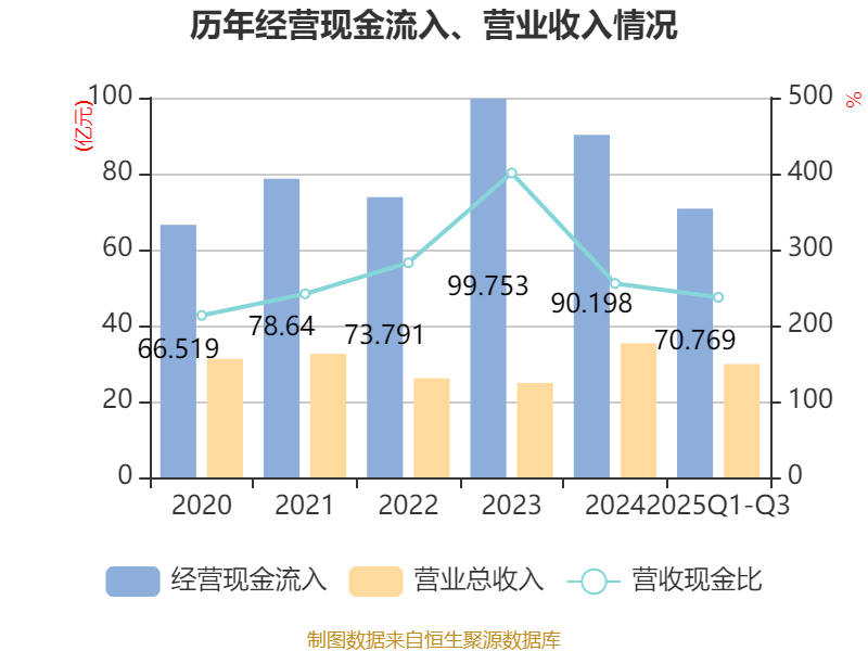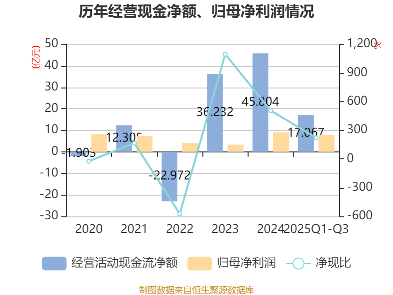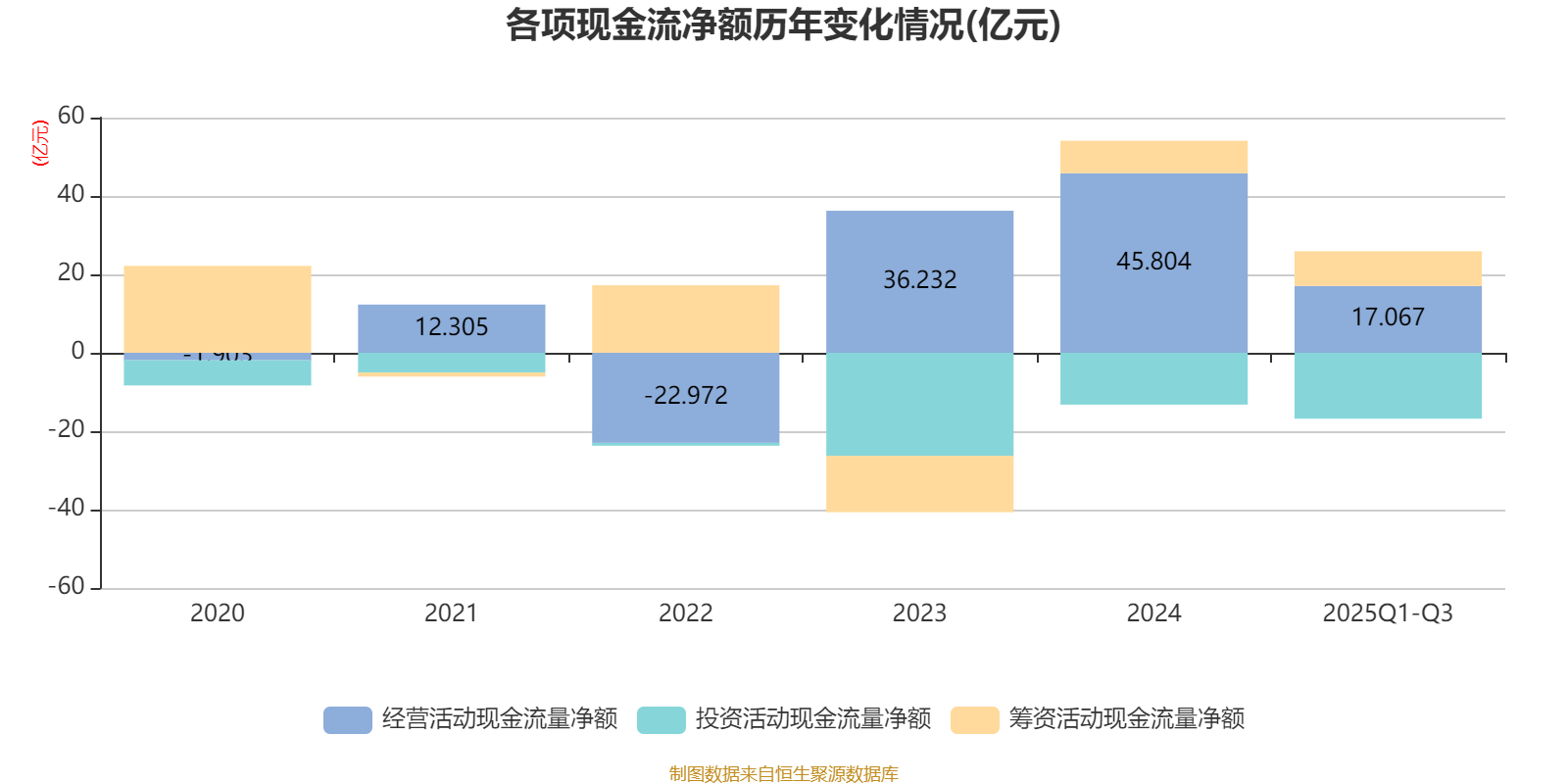 2025年前三季度,公司经营活动现金流净额为17.07亿元,同比下降0.55%;筹资活动现金流净额8.85亿元,同比增加6727.71万元;投资活动现金流净额-16.81亿元,上年同期为-4.51亿元。