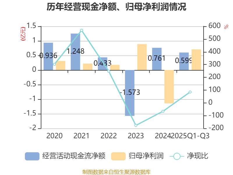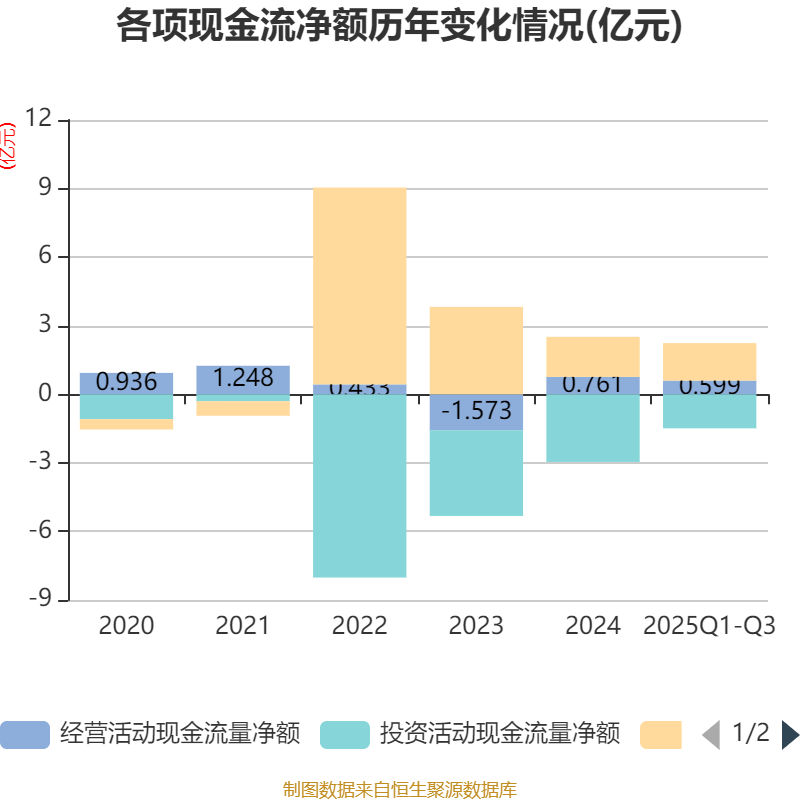2025年前三季度,公司经营活动现金流净额为5992.21万元,同比下降19.64%;筹资活动现金流净额1.64亿元,同比增加3183.12万元;投资活动现金流净额-1.49亿元,上年同期为-2.8亿元。