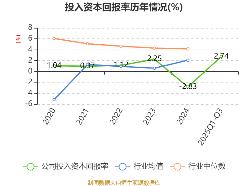 盈利能力方面, 2025年前三季度公司加权平均净资产收益率为4.37%,同比上升7.41个百分点。公司2025年前三季度投入资本回报率为2.74%,较上年同期上升3.87个百分点。