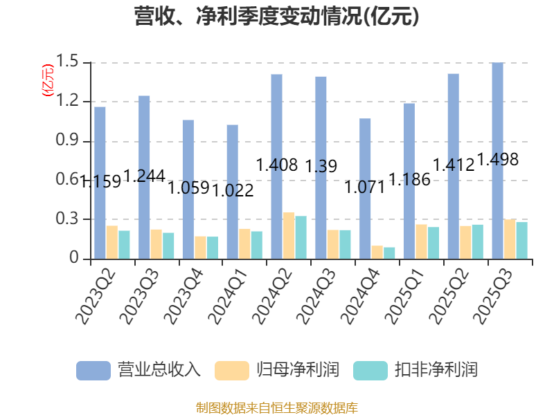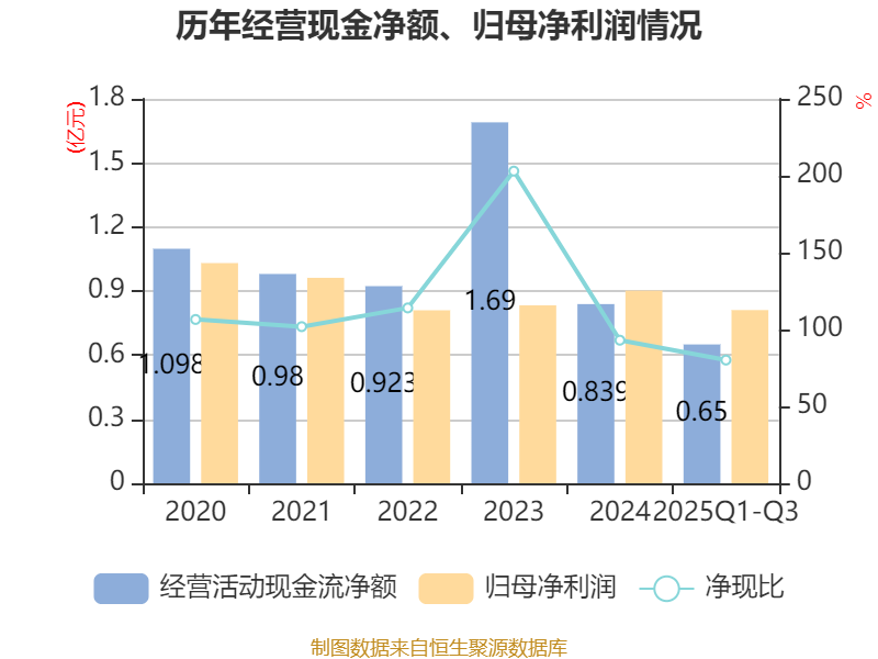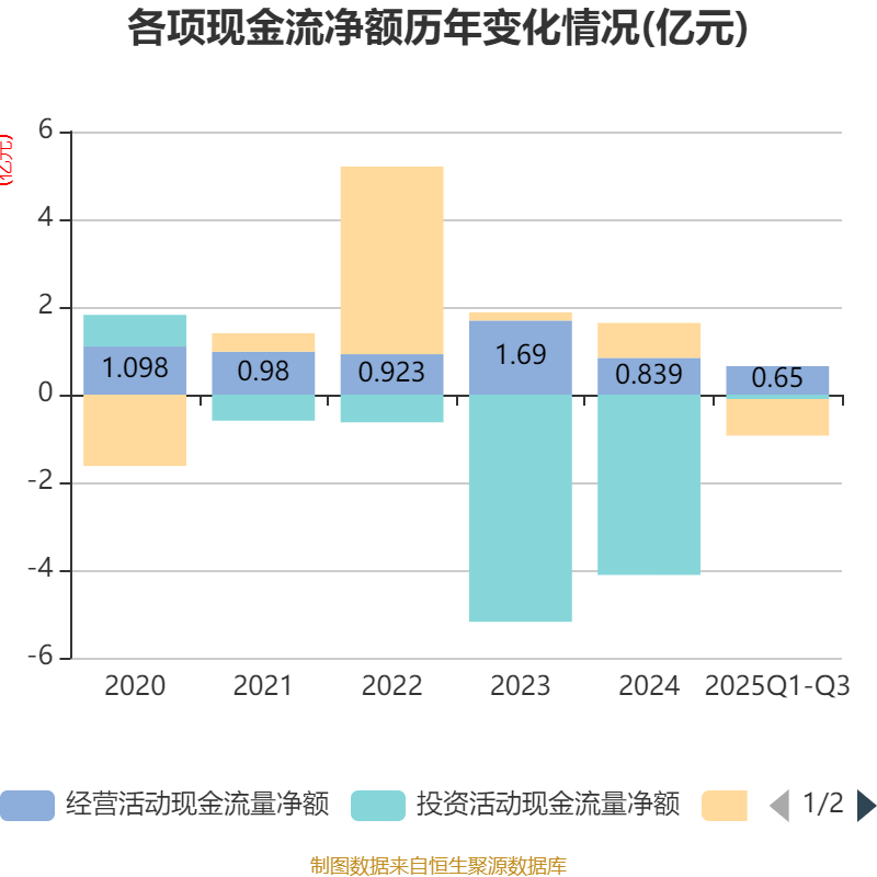 2025年前三季度,公司经营活动现金流净额为6500.86万元,同比下降0.18%;筹资活动现金流净额-8342.84万元,同比减少6270.29万元;投资活动现金流净额-995.22万元,上年同期为-1.09亿元。