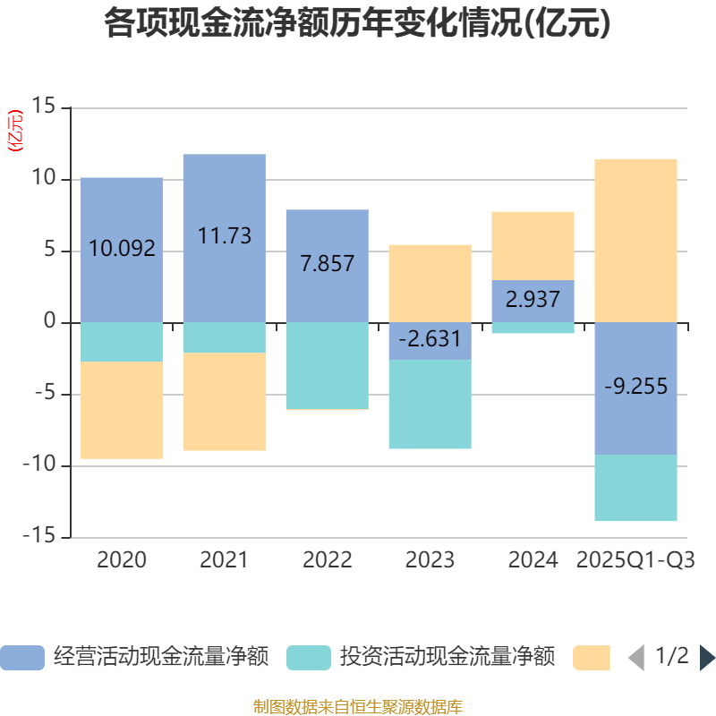 2025年前三季度,公司经营活动现金流净额为-9.25亿元,同比减少6.67亿元;筹资活动现金流净额11.38亿元,同比增加4.42亿元;投资活动现金流净额-4.63亿元,上年同期为-2.37亿元。