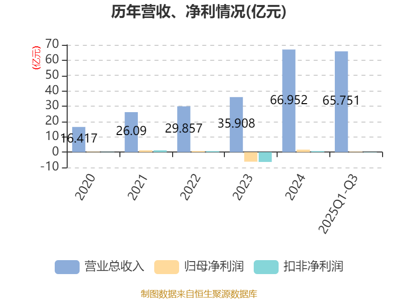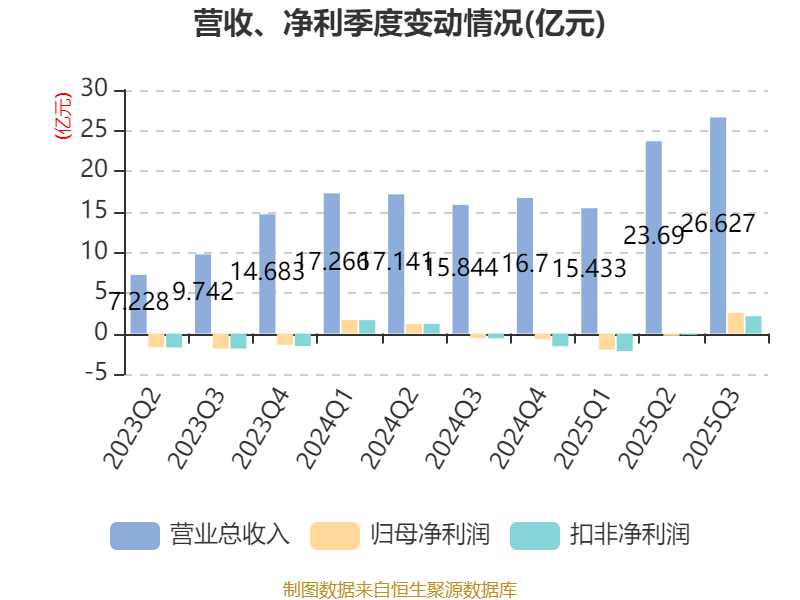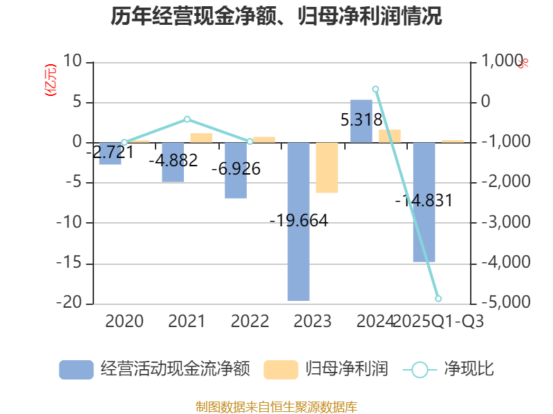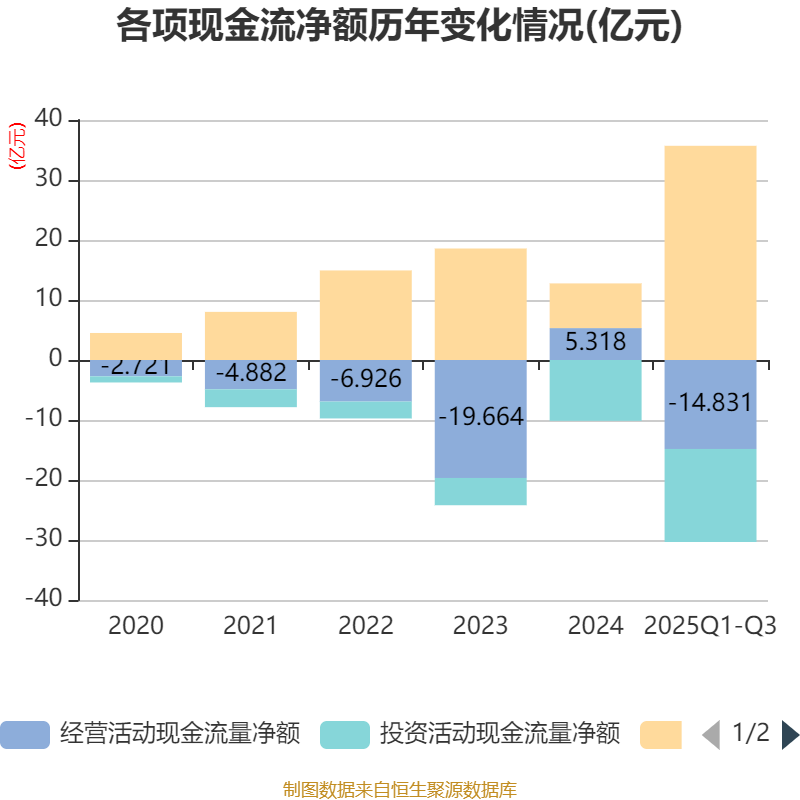 2025年前三季度,公司经营活动现金流净额为-14.83亿元,同比减少19.78亿元;筹资活动现金流净额35.7亿元,同比增加29.78亿元;投资活动现金流净额-15.5亿元,上年同期为-7.51亿元。