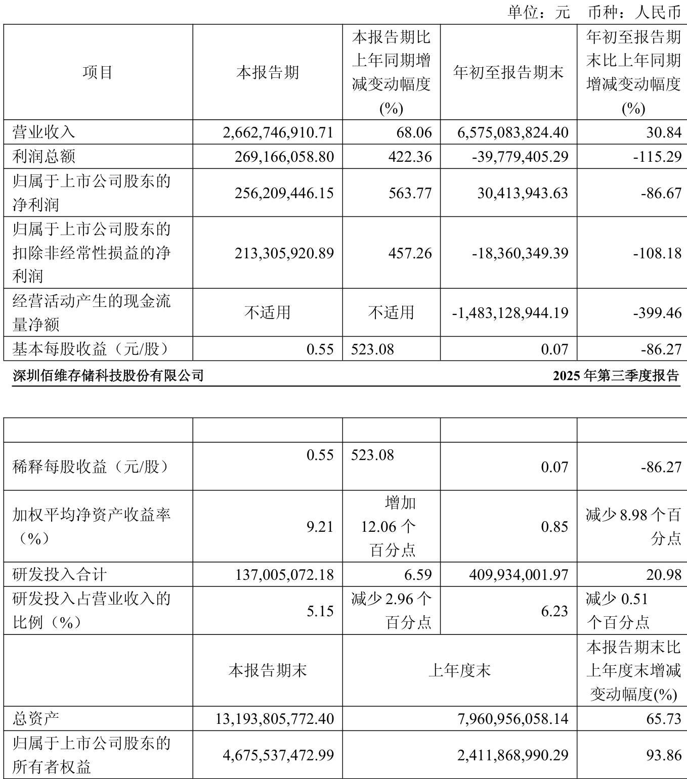 中证智能财讯佰维存储(688525)10月31日披露2025年第三季度报告。前三季度公司实现营业总收入65.75亿元,同比增长30.84%;归母净利润3041.39万元,同比下降86.67%;扣非净利润亏损1836.03万元,上年同期盈利2.25亿元;经营活动产生的现金流量净额为-14.83亿元,上年同期为4.95亿元;报告期内,佰维存储基本每股收益为0.07元,加权平均净资产收益率为0.85%。