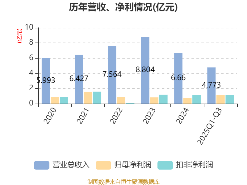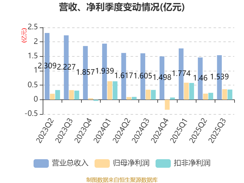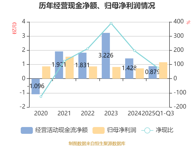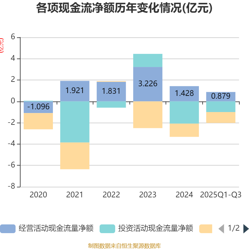 2025年前三季度,公司经营活动现金流净额为8790.98万元,同比增加9580.14万元;筹资活动现金流净额-1.02亿元,同比减少4705.1万元;投资活动现金流净额-1亿元,上年同期为-2.11亿元。