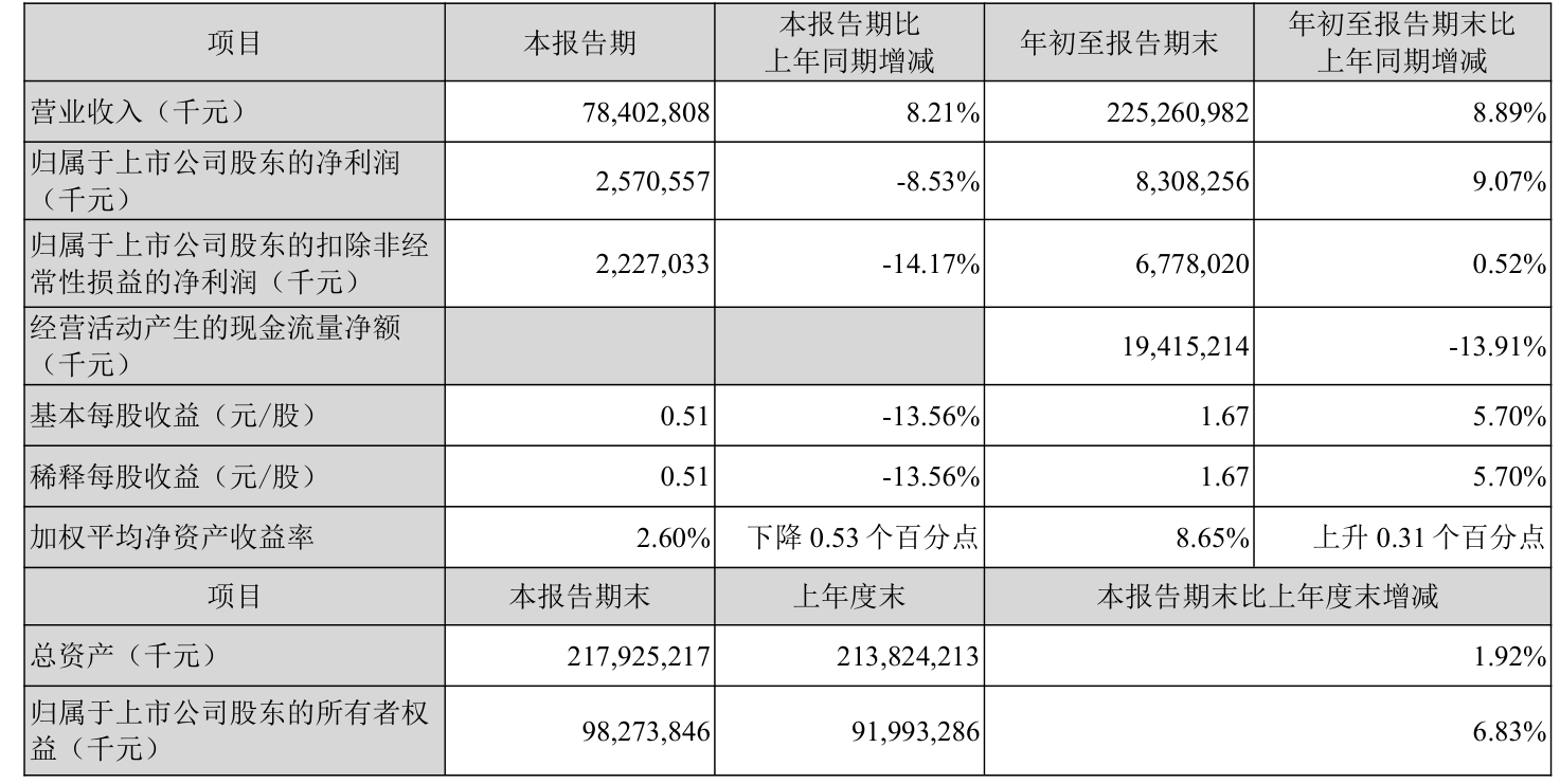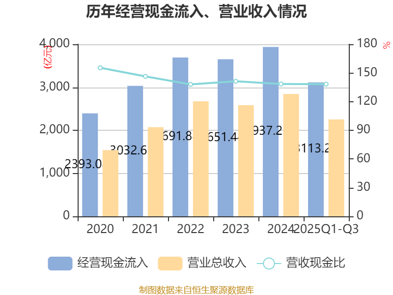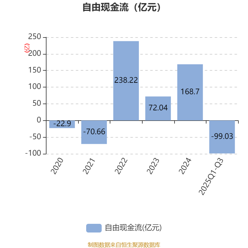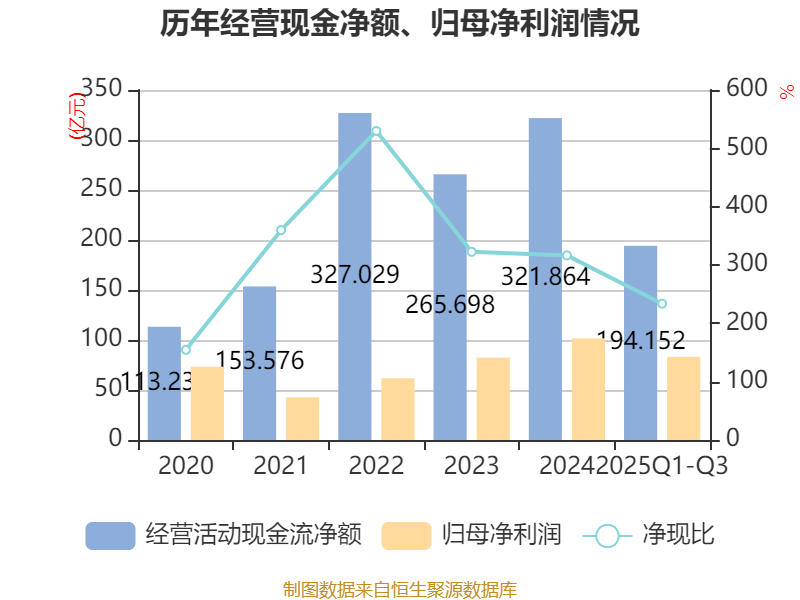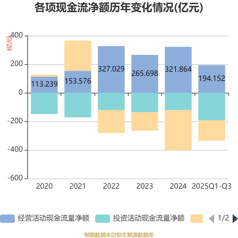 2025年前三季度,公司经营活动现金流净额为194.15亿元,同比下降13.91%;筹资活动现金流净额-143.76亿元,同比增加37.88亿元;投资活动现金流净额-191.74亿元,上年同期为-235.46亿元。