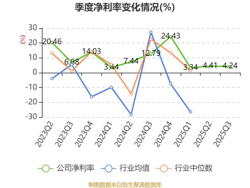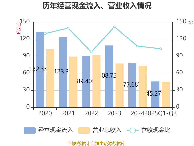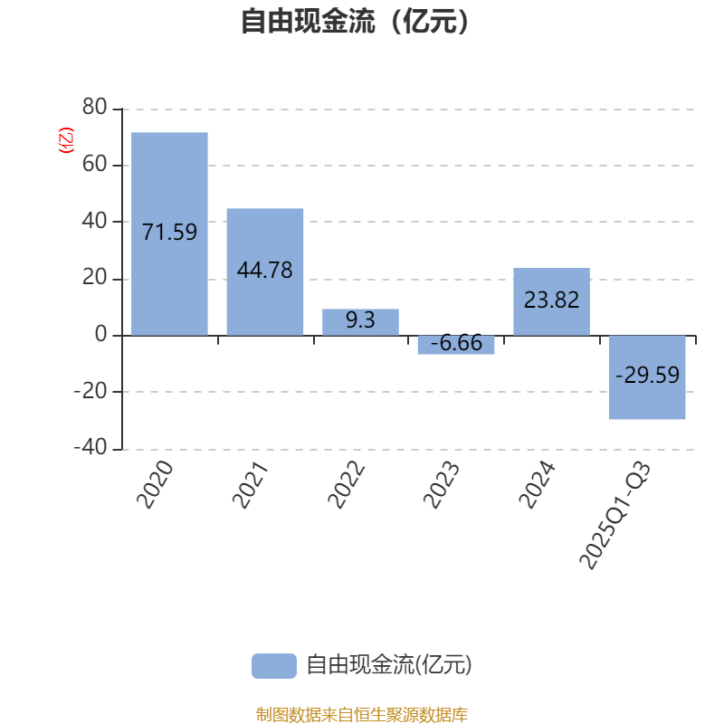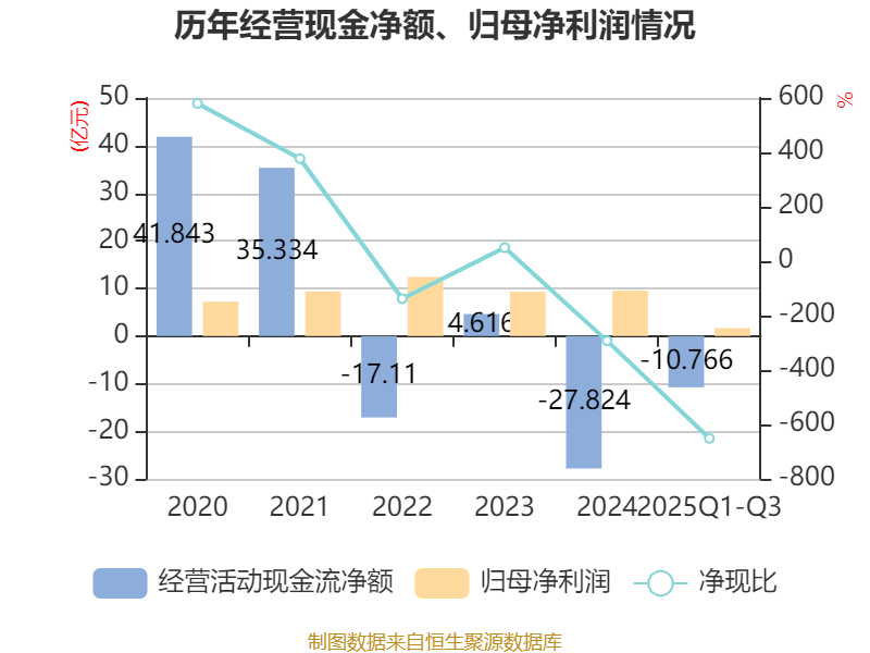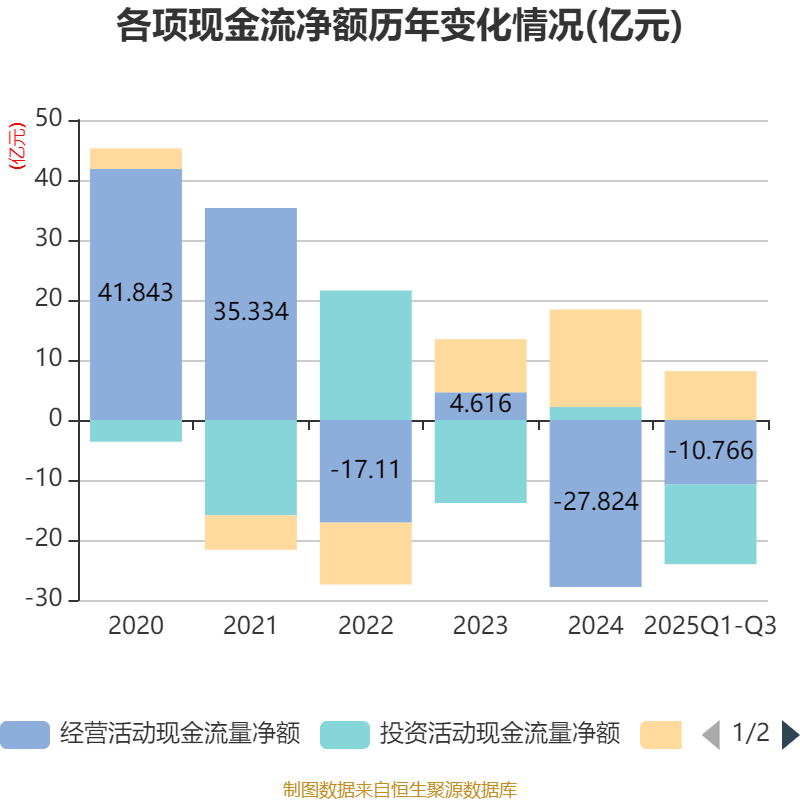 2025年前三季度,公司经营活动现金流净额为-10.77亿元,同比增加15.41亿元;筹资活动现金流净额8.14亿元,同比减少2.04亿元;投资活动现金流净额-13.27亿元,上年同期为-6.8亿元。