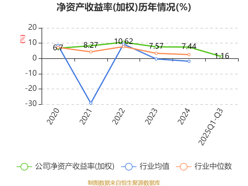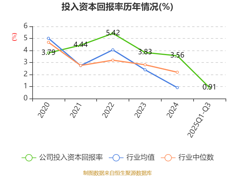 盈利能力方面, 2025年前三季度公司加权平均净资产收益率为1.16%,同比下降2.31个百分点。公司2025年前三季度投入资本回报率为0.91%,较上年同期下降0.9个百分点。