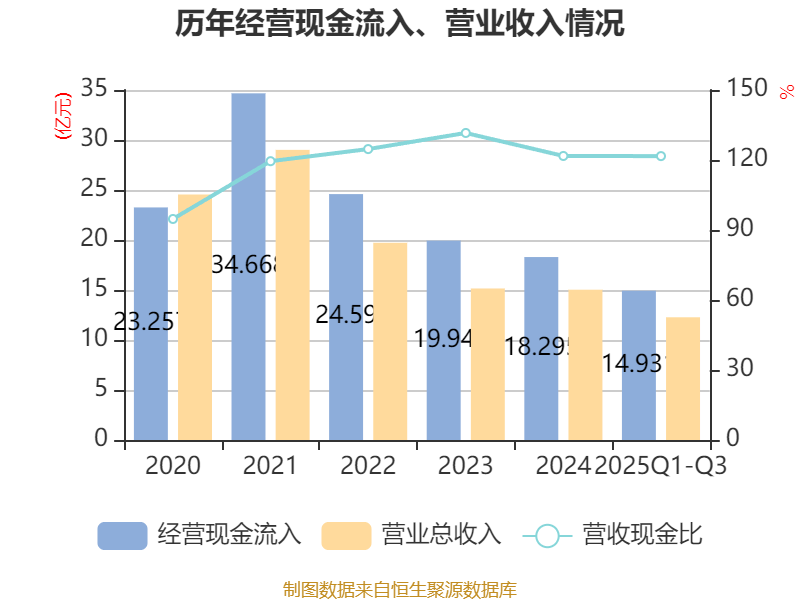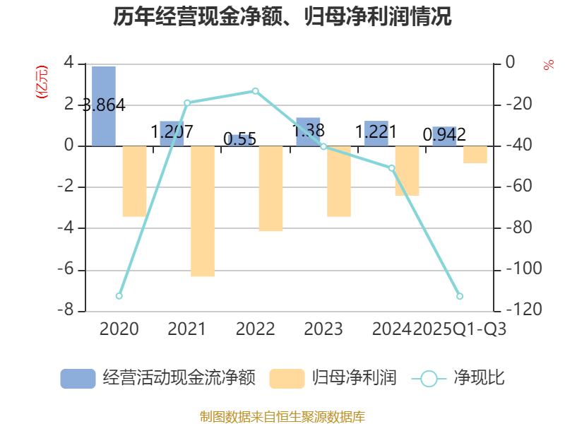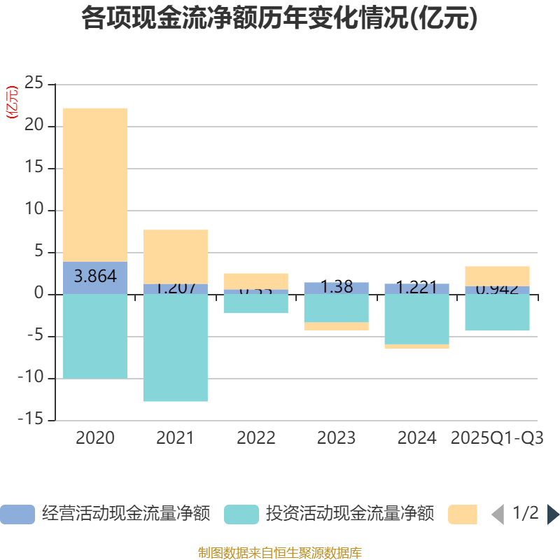 2025年前三季度,公司经营活动现金流净额为9417.54万元,同比下降2.06%;筹资活动现金流净额2.35亿元,同比增加2.57亿元;投资活动现金流净额-4.35亿元,上年同期为-4.89亿元。