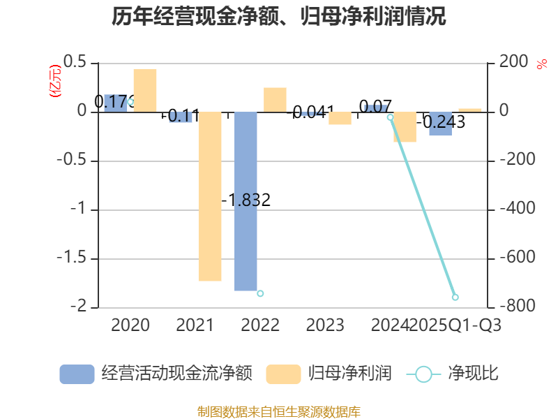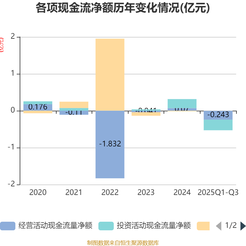 2025年前三季度,公司经营活动现金流净额为-2431.31万元,同比减少2010.9万元;筹资活动现金流净额25.28万元,同比增加278.41万元;投资活动现金流净额-2869.29万元,上年同期为1460.41万元。