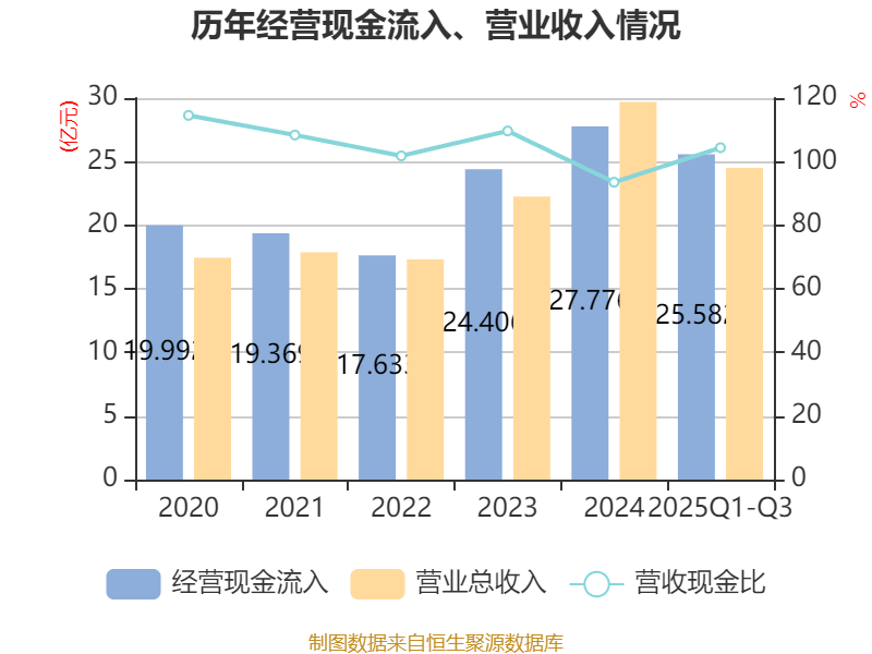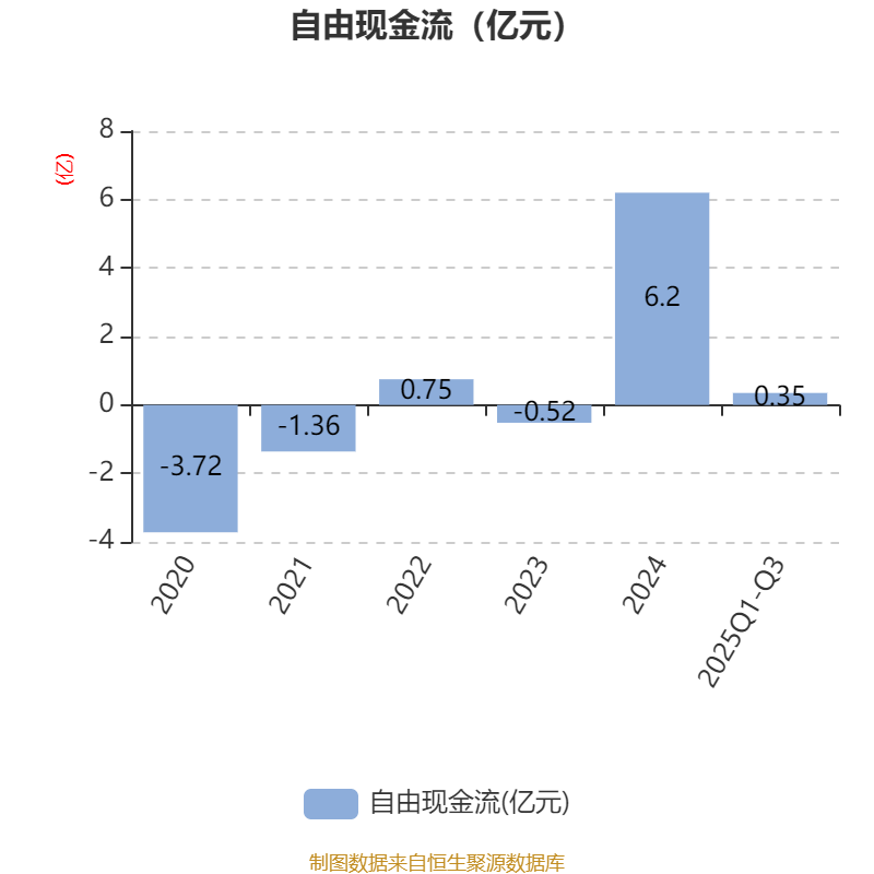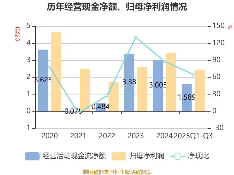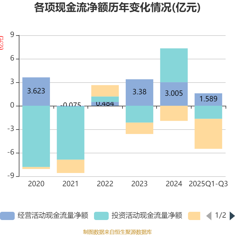 2025年前三季度,公司经营活动现金流净额为1.59亿元,同比增长132.19%;筹资活动现金流净额-3.83亿元,同比减少2.95亿元;投资活动现金流净额-1.67亿元,上年同期为2.94亿元。