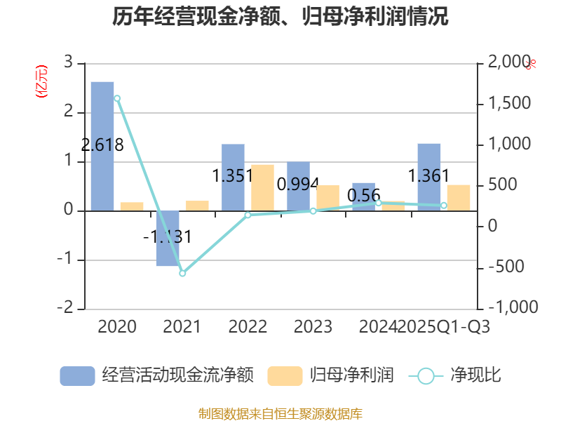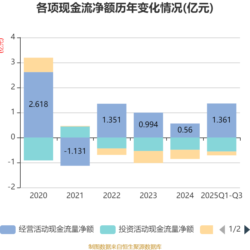 2025年前三季度,公司经营活动现金流净额为1.36亿元,同比增长18.64%;筹资活动现金流净额-1552.1万元,同比增加339.09万元;投资活动现金流净额-5590.95万元,上年同期为-3057.32万元。