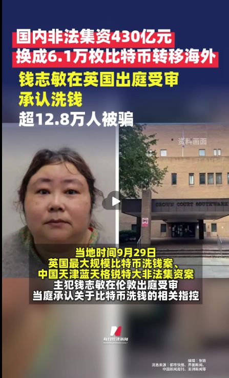 据都市快报,当地时间9月29日,英国最大规模比特币洗钱案、中国天津蓝天格锐特大非法集资案主犯钱志敏在伦敦出庭受审,当庭承认关于比特币洗钱的相关指控。该案中有超过12.8万人被骗,涉及6.1万枚比特币(约合人民币493.5亿元),她承认获取并持有这些非法所得。