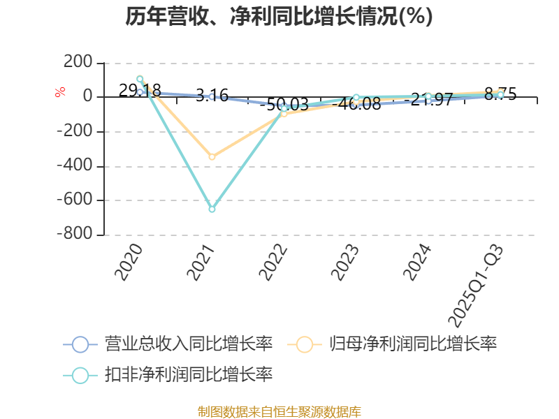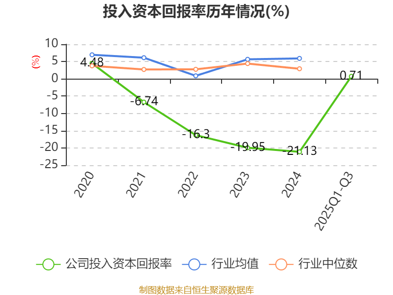 盈利能力方面, 2025年前三季度公司加权平均净资产收益率为-6.56%,同比下降2.34个百分点。公司2025年前三季度投入资本回报率为0.71%,较上年同期上升0.75个百分点。
