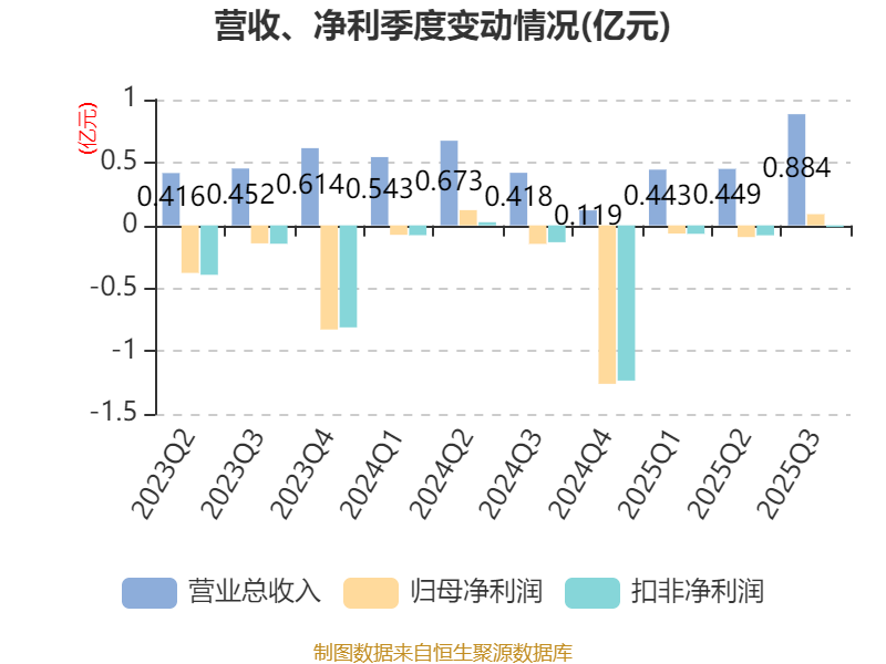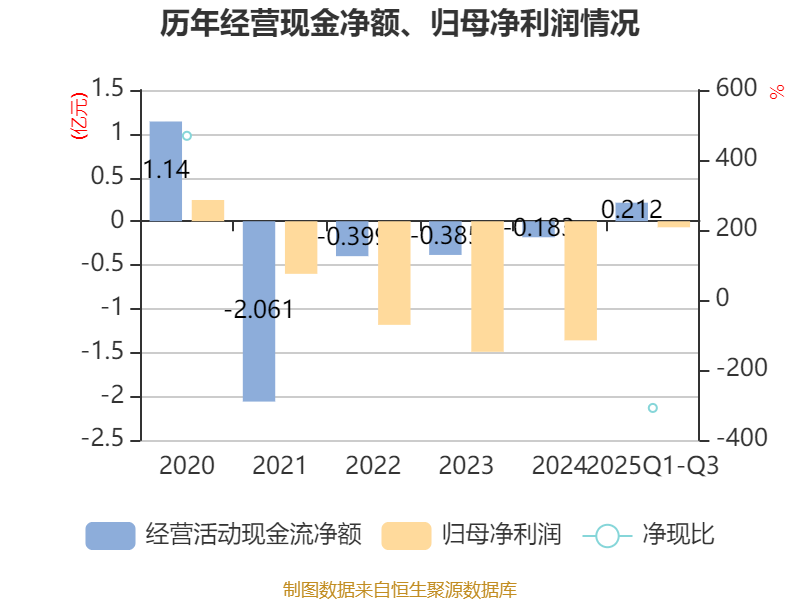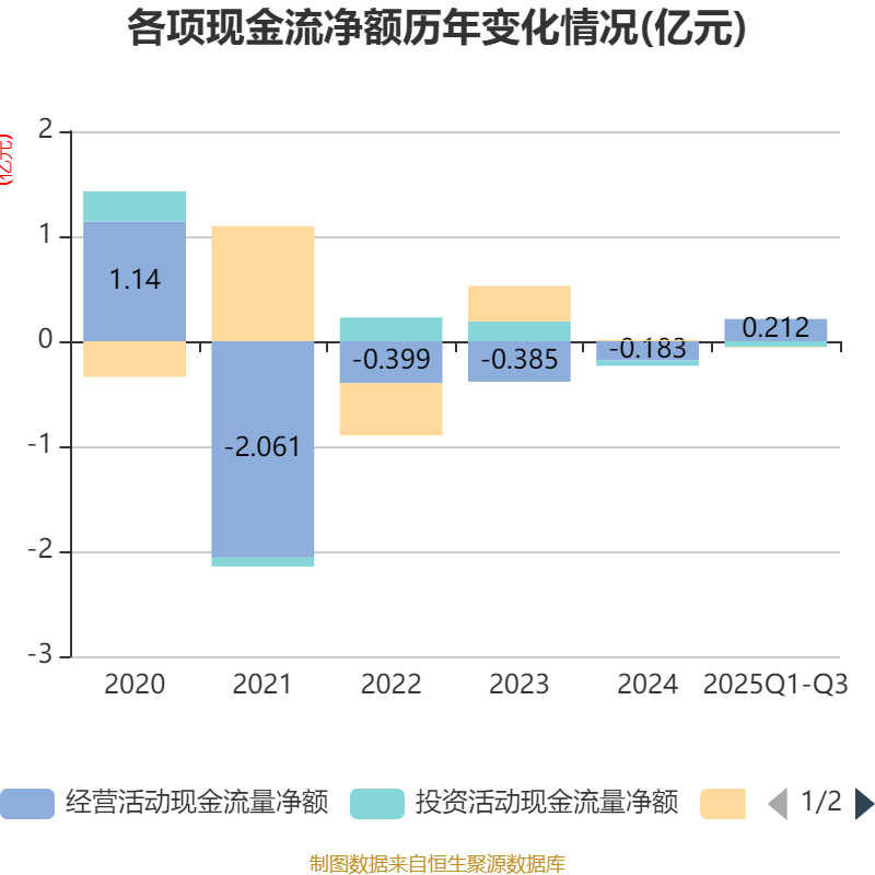 2025年前三季度,公司经营活动现金流净额为2121.5万元,同比增加3852.98万元;筹资活动现金流净额-47.59万元,同比增加437.98万元;投资活动现金流净额-539.27万元,上年同期为-169.66万元。