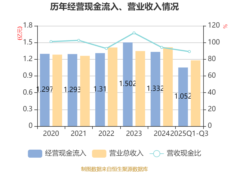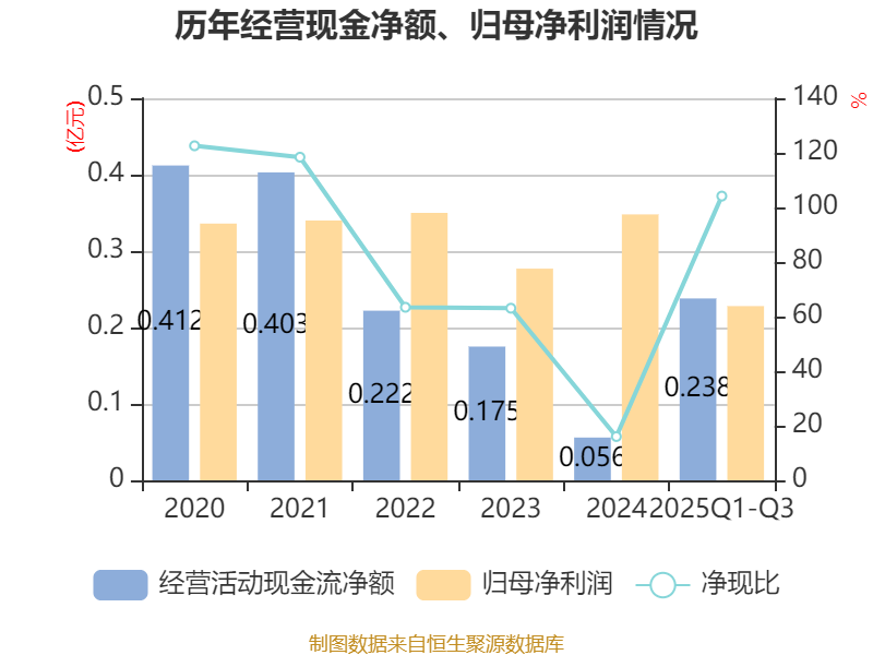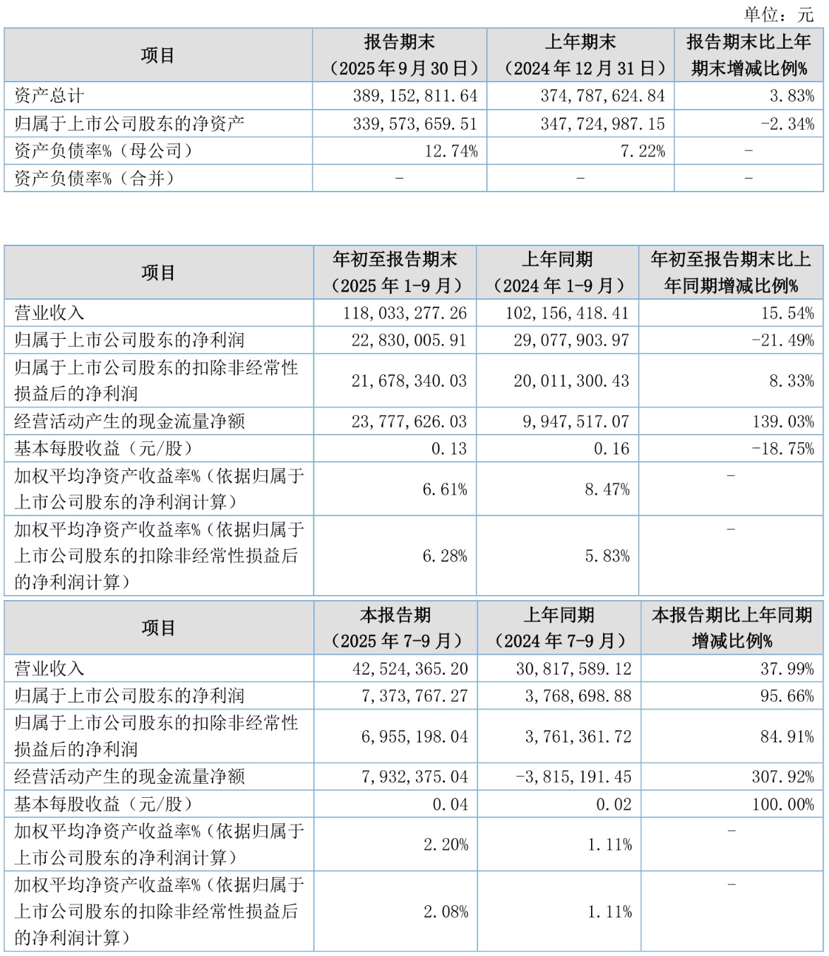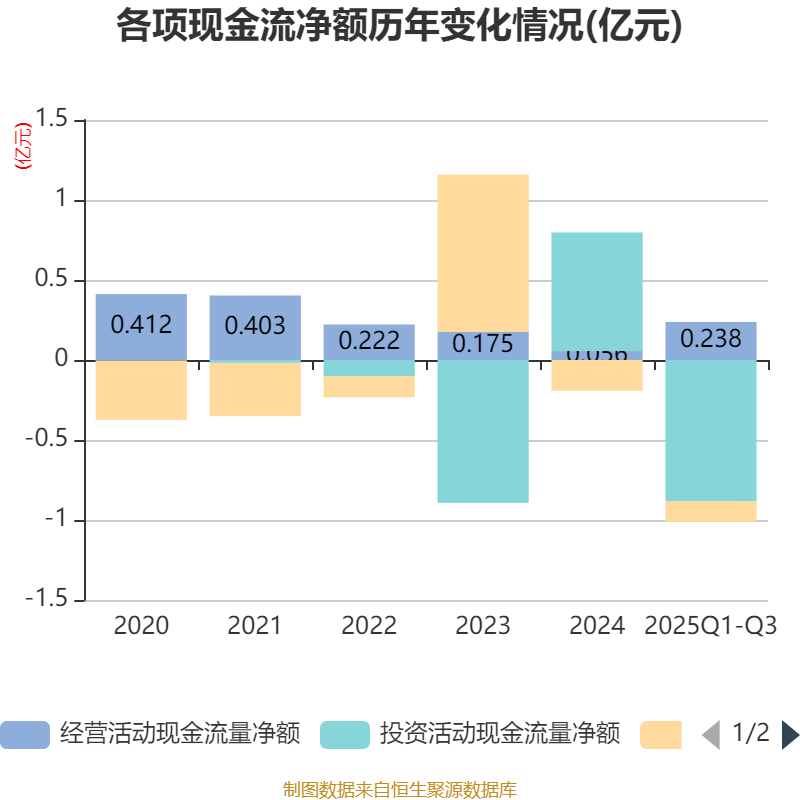 2025年前三季度,公司经营活动现金流净额为2377.76万元,同比增长139.03%;筹资活动现金流净额-1278.89万元,同比增加1224.78万元;投资活动现金流净额-8832.48万元,上年同期为-2160.43万元。