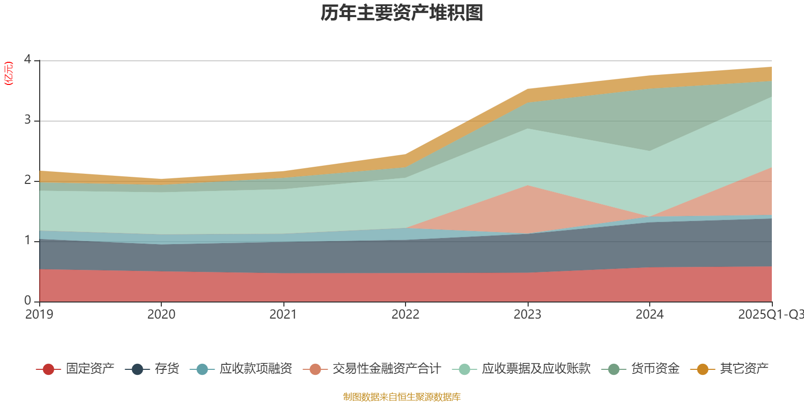 资产重大变化方面,截至2025年三季度末,公司货币资金较上年末减少74.75%,占公司总资产比重下降20.86个百分点;交易性金融资产合计占公司总资产的20.3%,上年末为0;预付款项较上年末减少77.09%,占公司总资产比重下降1.65个百分点;使用权资产较上年末增加369.26%,占公司总资产比重上升1.09个百分点。