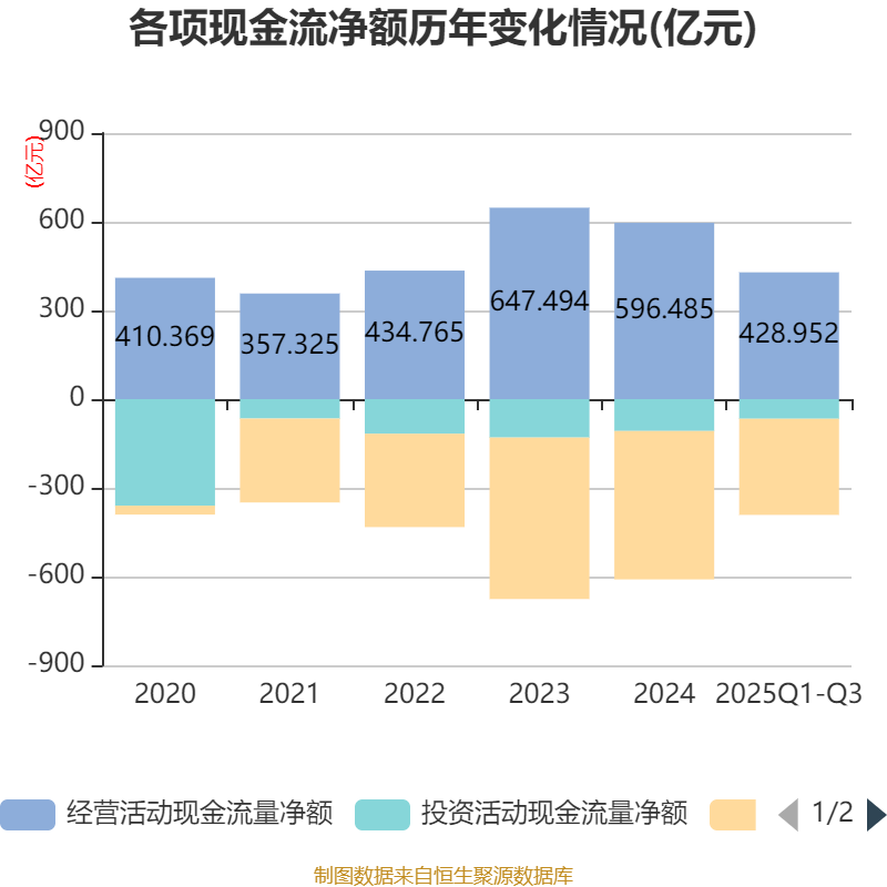 2025年前三季度,公司经营活动现金流净额为428.95亿元,同比下降9.98%;筹资活动现金流净额-325.05亿元,同比增加107.16亿元;投资活动现金流净额-66.41亿元,上年同期为-56.79亿元。