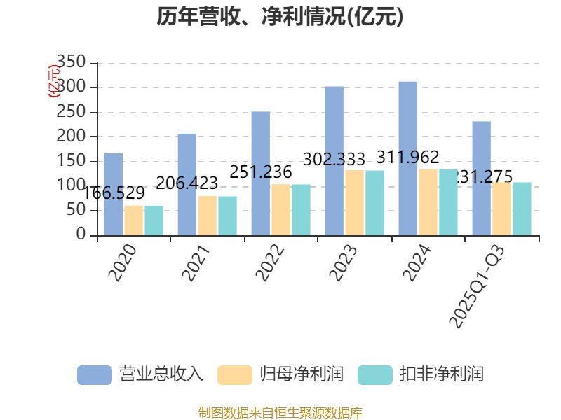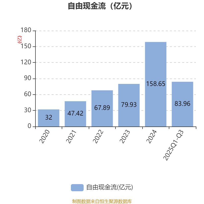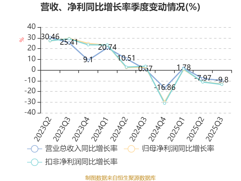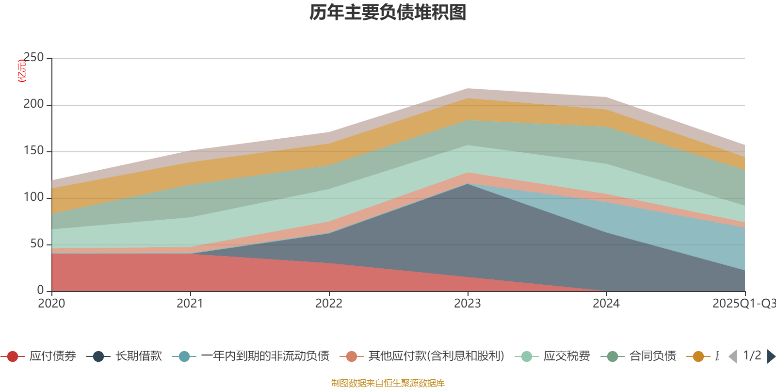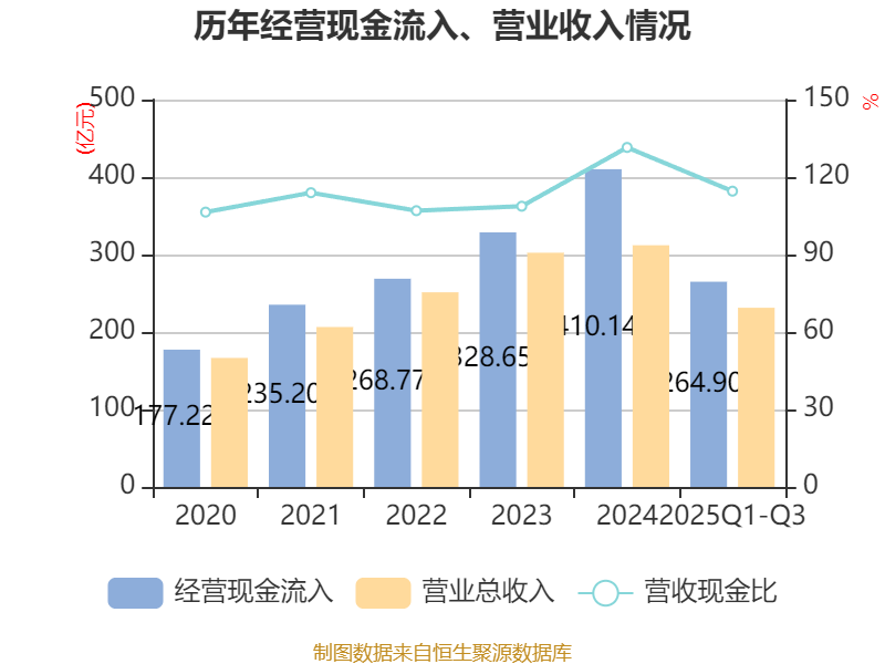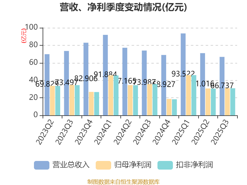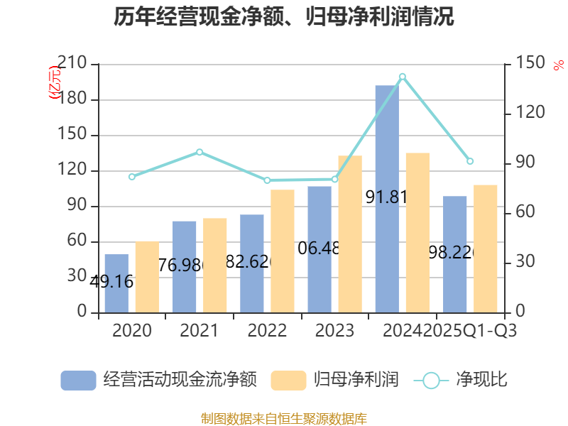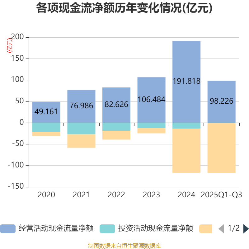 2025年前三季度,公司经营活动现金流净额为98.23亿元,同比下降21.2%;筹资活动现金流净额-116.91亿元,同比减少44.25亿元;投资活动现金流净额-9061.43万元,上年同期为-9.39亿元。