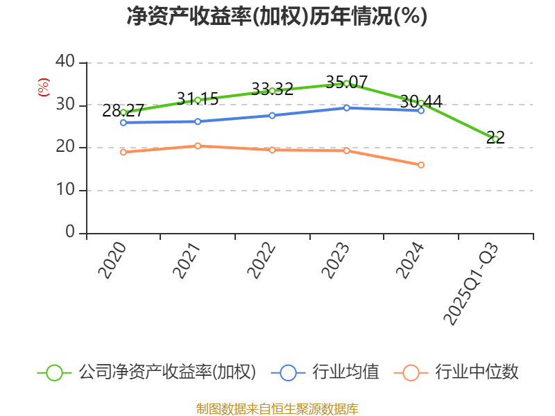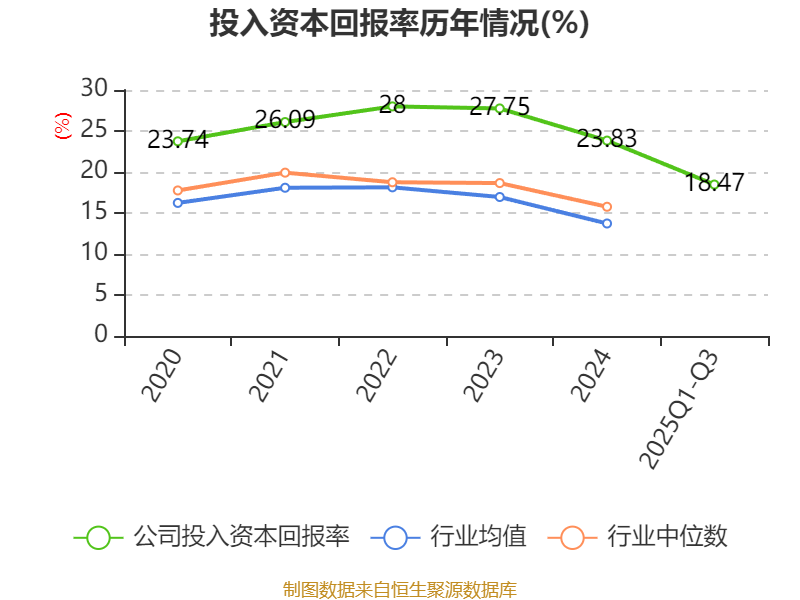 盈利能力方面, 2025年前三季度公司加权平均净资产收益率为22%,同比下降3.88个百分点。公司2025年前三季度投入资本回报率为18.47%,较上年同期下降2.06个百分点。
