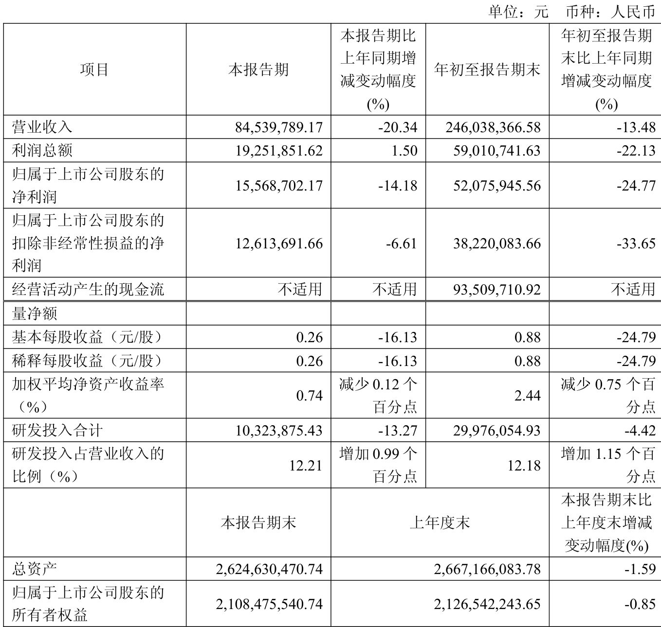 中证智能财讯双元科技(688623)10月31日披露2025年第三季度报告。前三季度公司实现营业总收入2.46亿元,同比下降13.48%;归母净利润5207.59万元,同比下降24.77%;扣非净利润3822.01万元,同比下降33.65%;经营活动产生的现金流量净额为9350.97万元,上年同期为-630.41万元;报告期内,双元科技基本每股收益为0.88元,加权平均净资产收益率为2.44%。
