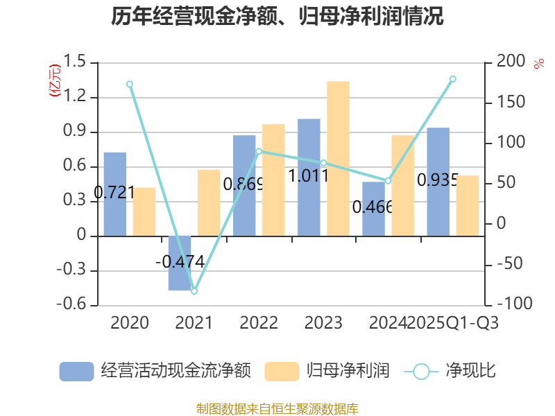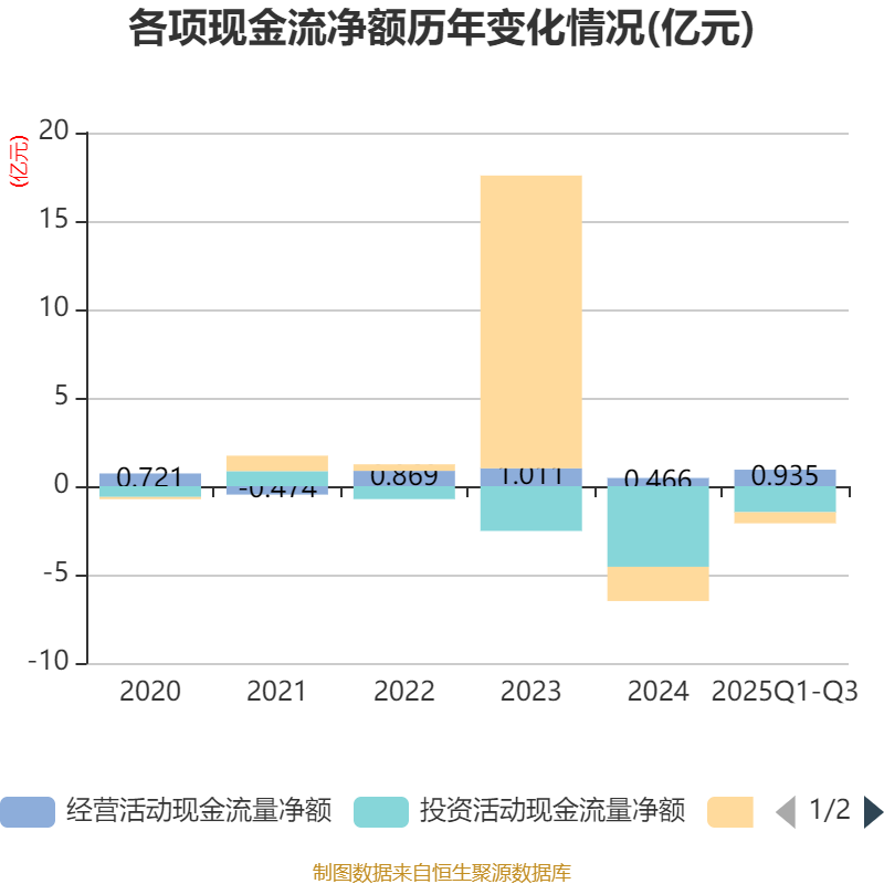 2025年前三季度,公司经营活动现金流净额为9350.97万元,同比增加9981.38万元;筹资活动现金流净额-6281.78万元,同比增加1.15亿元;投资活动现金流净额-1.47亿元,上年同期为-4.88亿元。