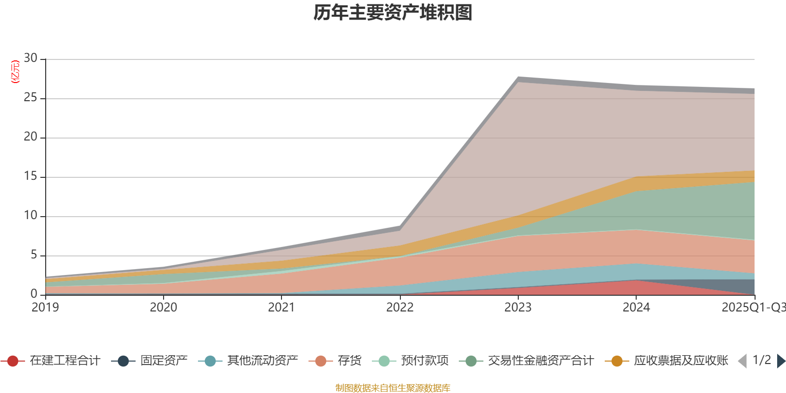 资产重大变化方面,截至2025年三季度末,公司交易性金融资产合计较上年末增加51.82%,占公司总资产比重上升9.85个百分点;固定资产较上年末增加1945.23%,占公司总资产比重上升7.09个百分点;在建工程合计较上年末减少99.9%,占公司总资产比重下降6.84个百分点;其他流动资产较上年末减少62.83%,占公司总资产比重下降4.8个百分点。