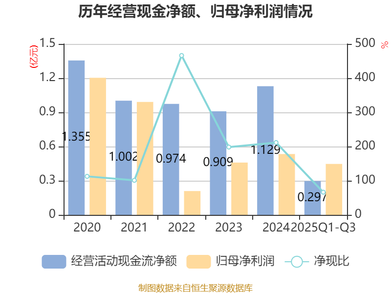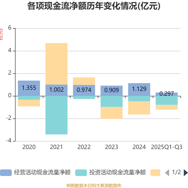 2025年前三季度,公司经营活动现金流净额为2965.4万元,同比下降38.05%;筹资活动现金流净额-4195.2万元,同比增加7367.51万元;投资活动现金流净额-7990.39万元,上年同期为-2130.93万元。