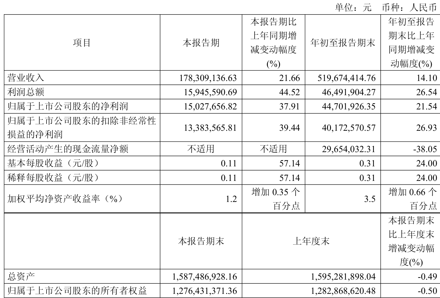 中证智能财讯浙江黎明(603048)10月31日披露2025年第三季度报告。前三季度公司实现营业总收入5.2亿元,同比增长14.10%;归母净利润4470.19万元,同比增长21.54%;扣非净利润4017.26万元,同比增长26.93%;经营活动产生的现金流量净额为2965.4万元,同比下降38.05%;报告期内,浙江黎明基本每股收益为0.31元,加权平均净资产收益率为3.50%。