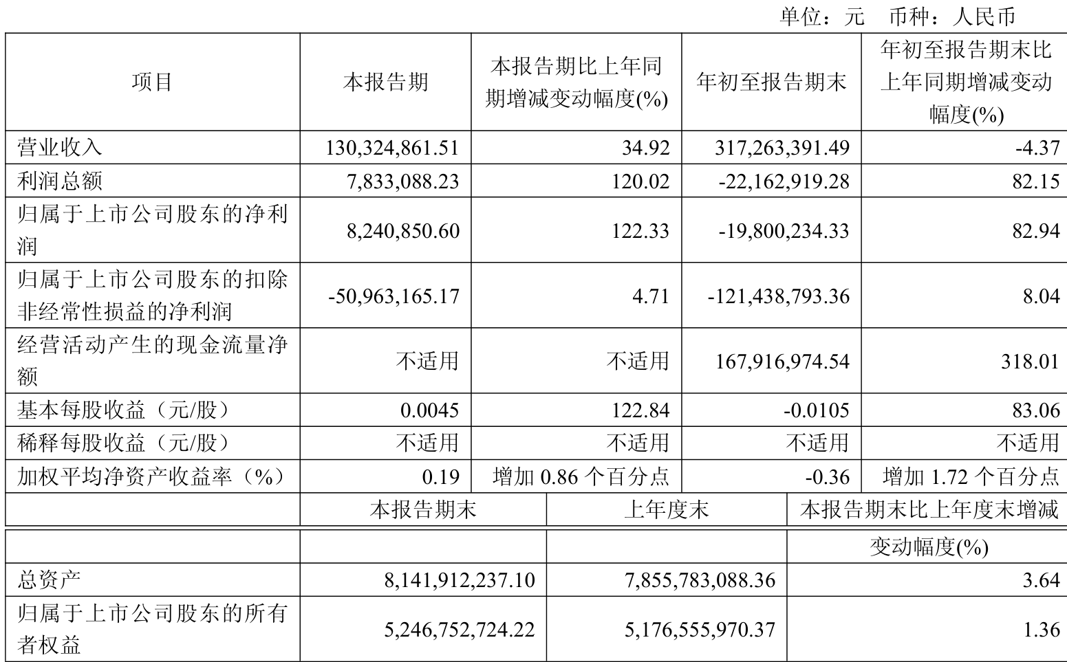 中证智能财讯万通发展(600246)10月31日披露2025年第三季度报告。前三季度公司实现营业总收入3.17亿元,同比下降4.37%;归母净利润亏损1980.02万元,上年同期亏损1.16亿元;扣非净利润亏损1.21亿元,上年同期亏损1.32亿元;经营活动产生的现金流量净额为1.68亿元,上年同期为-7702.18万元;报告期内,万通发展基本每股收益为-0.0105元,加权平均净资产收益率为-0.36%。