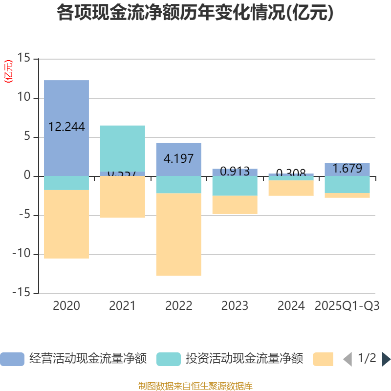 2025年前三季度,公司经营活动现金流净额为1.68亿元,同比增加2.45亿元;筹资活动现金流净额-6083.52万元,同比增加3546.88万元;投资活动现金流净额-2.19亿元,上年同期为-1.67亿元。