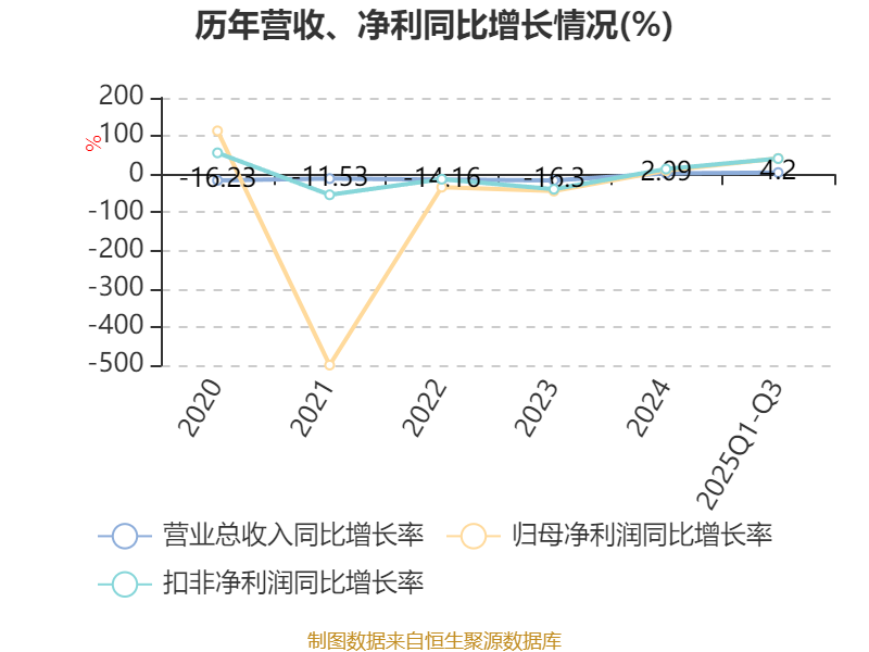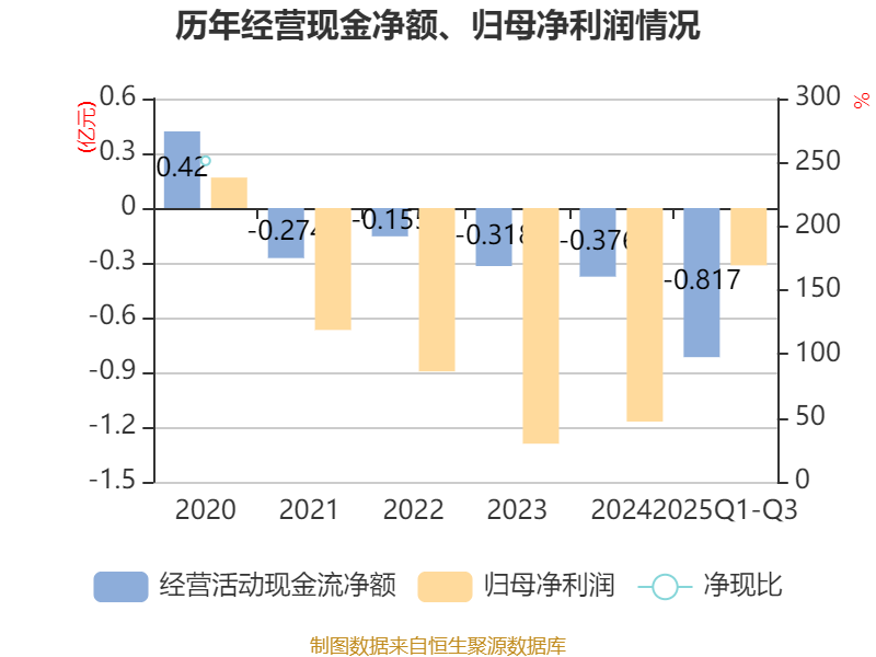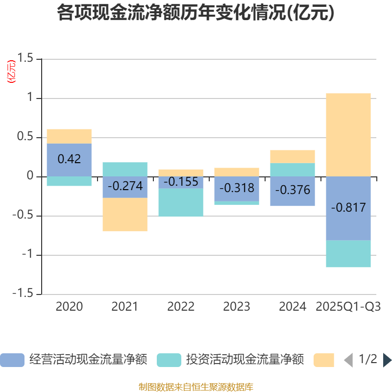 2025年前三季度,公司经营活动现金流净额为-8165.47万元,同比减少5247.77万元;筹资活动现金流净额1.06亿元,同比增加1.08亿元;投资活动现金流净额-3408.52万元,上年同期为1993.9万元。