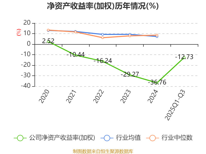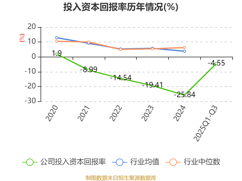 盈利能力方面, 2025年前三季度公司加权平均净资产收益率为-12.73%,同比上升2.52个百分点。公司2025年前三季度投入资本回报率为-4.55%,较上年同期上升7.08个百分点。