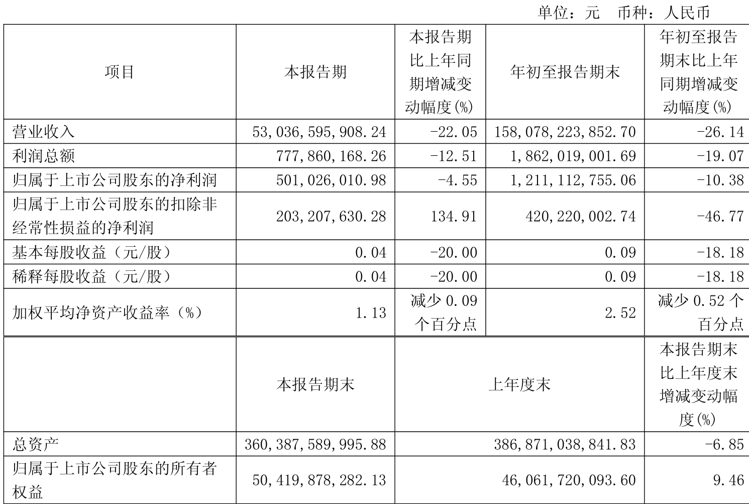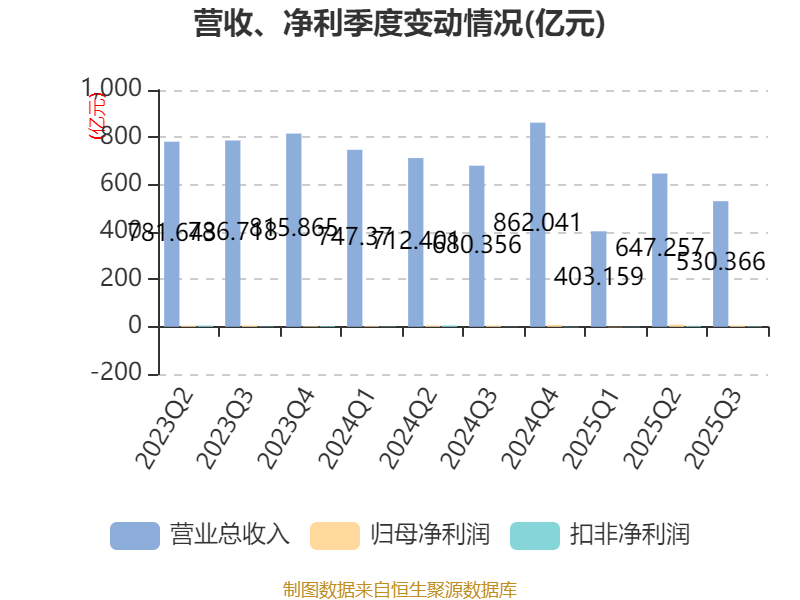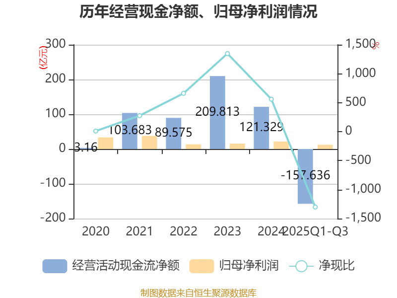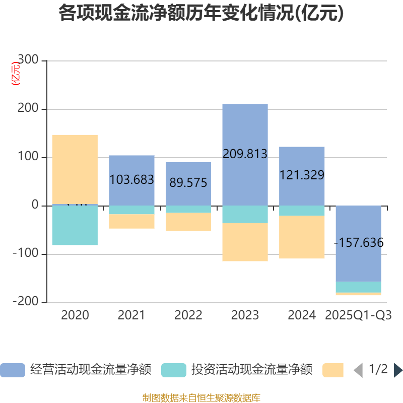 2025年前三季度,公司经营活动现金流净额为-157.64亿元,同比增加57.3亿元;筹资活动现金流净额-5.48亿元,同比减少5.18亿元;投资活动现金流净额-22.41亿元,上年同期为-41.88亿元。