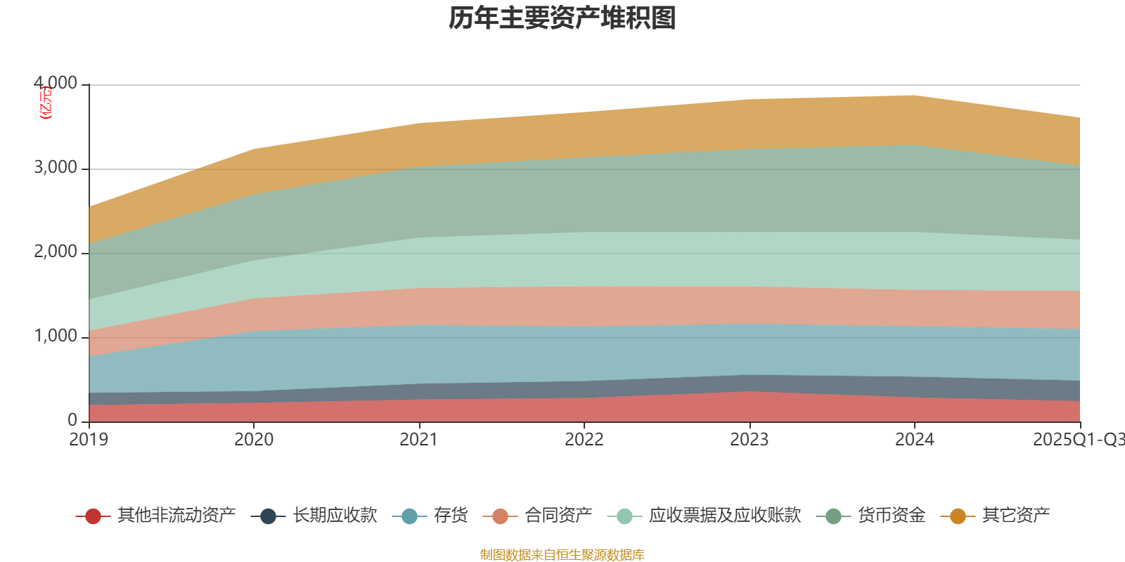 资产重大变化方面,截至2025年三季度末,公司货币资金较上年末减少14.98%,占公司总资产比重下降2.34个百分点;合同资产较上年末增加5.81%,占公司总资产比重上升1.51个百分点;存货较上年末增加1.84%,占公司总资产比重上升1.44个百分点;应收票据及应收账款较上年末减少11.97%,占公司总资产比重下降0.98个百分点。