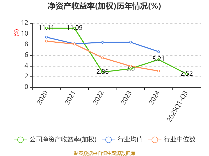 盈利能力方面, 2025年前三季度公司加权平均净资产收益率为2.52%,同比下降0.52个百分点。公司2025年前三季度投入资本回报率为1.45%,较上年同期下降0.25个百分点。