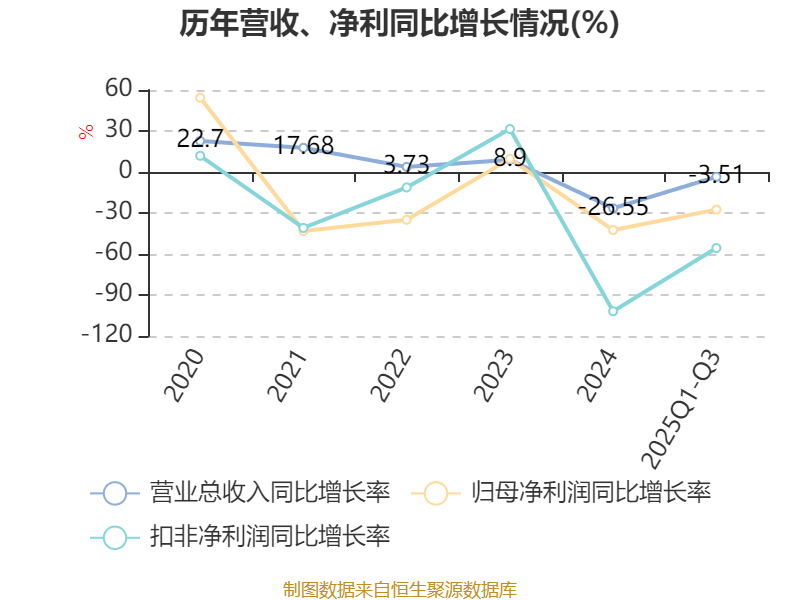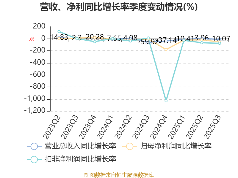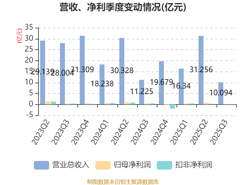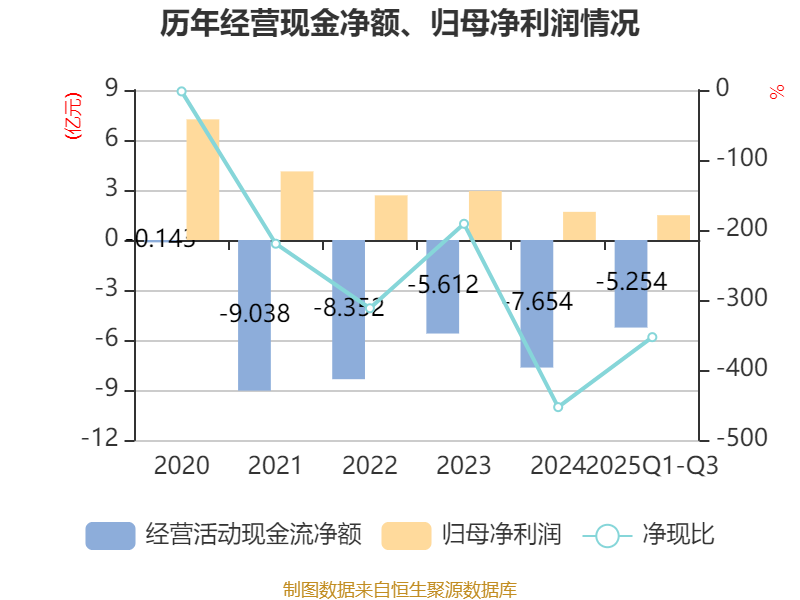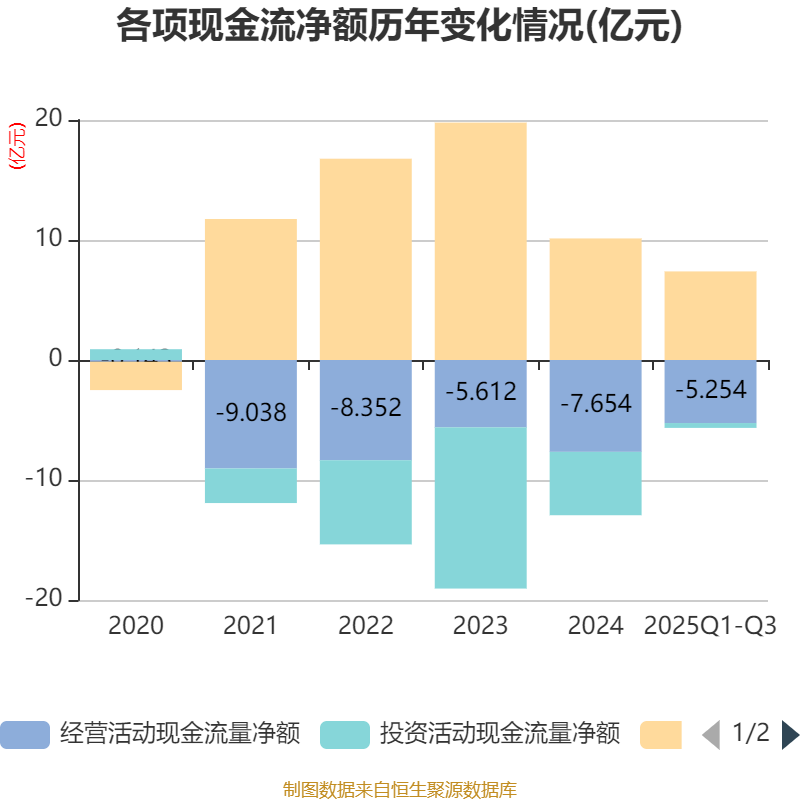2025年前三季度,公司经营活动现金流净额为-5.25亿元,同比增加7414.08万元;筹资活动现金流净额7.38亿元,同比增加1.31亿元;投资活动现金流净额-4040.77万元,上年同期为-2.24亿元。