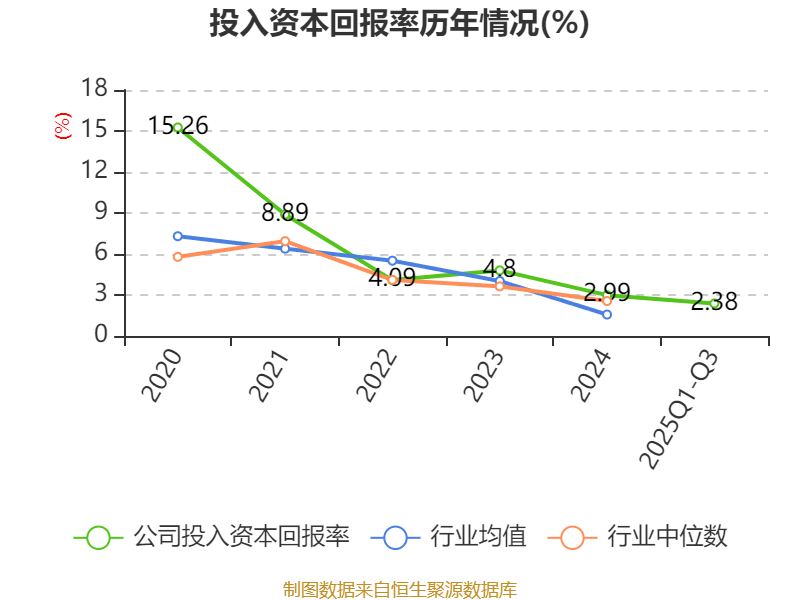盈利能力方面, 2025年前三季度公司加权平均净资产收益率为2.97%,同比下降1.05个百分点。公司2025年前三季度投入资本回报率为2.38%,较上年同期下降0.6个百分点。