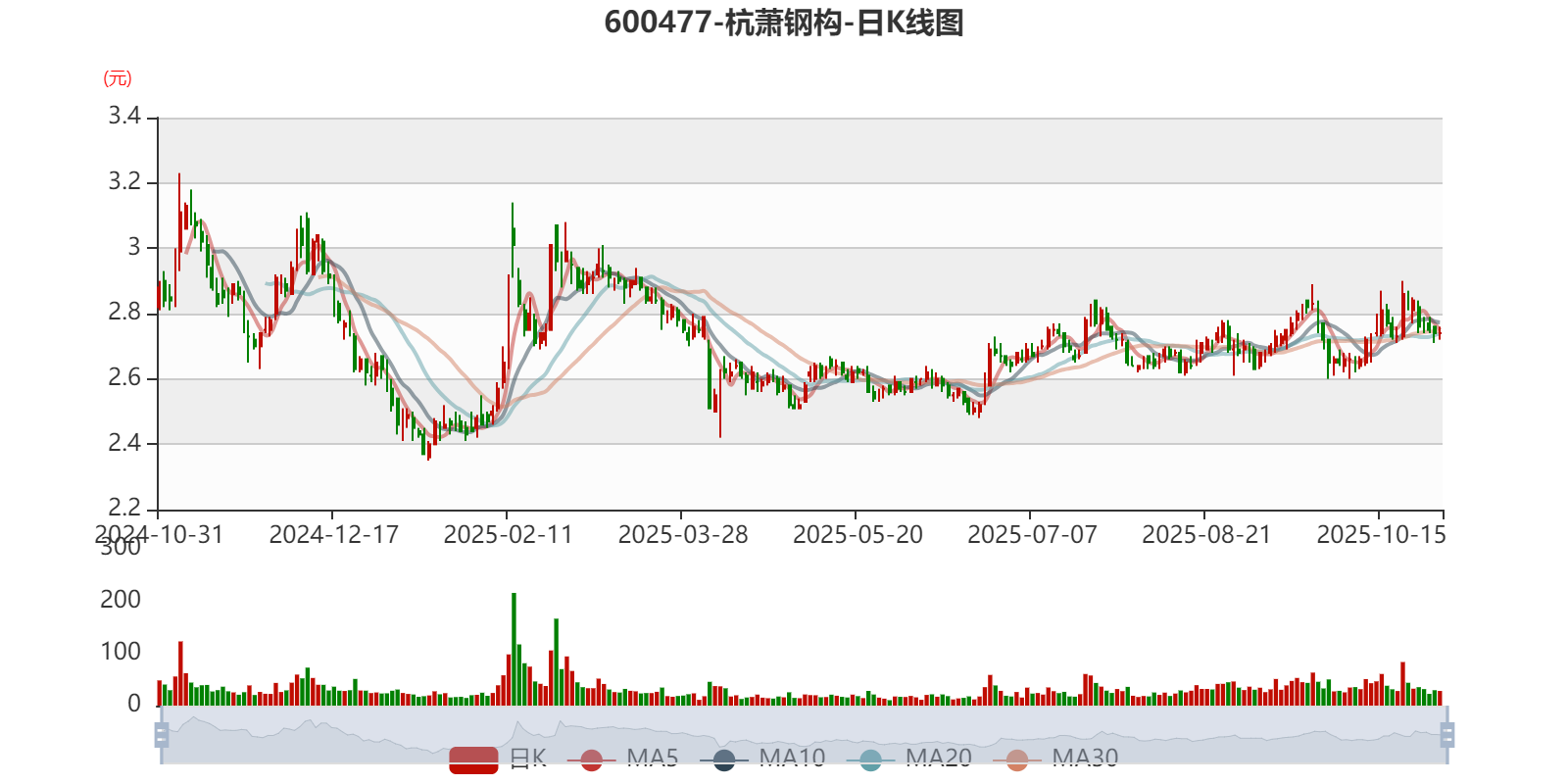 中证智能财讯杭萧钢构(600477)10月31日披露2025年第三季度报告。前三季度公司实现营业总收入57.69亿元,同比下降3.51%;归母净利润1.49亿元,同比下降27.51%;扣非净利润8318.26万元,同比下降55.64%;经营活动产生的现金流量净额为-5.25亿元,上年同期为-6亿元;报告期内,杭萧钢构基本每股收益为0.0628元,加权平均净资产收益率为2.97%。