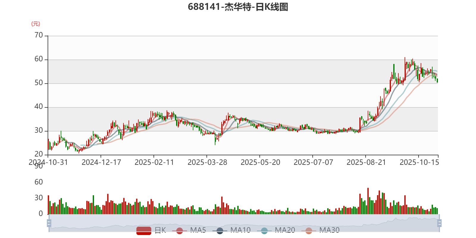 以10月30日收盘价计算,杰华特目前市盈率(TTM)约为-40.82倍,市净率(LF)约13.1倍,市销率(TTM)约9.35倍。