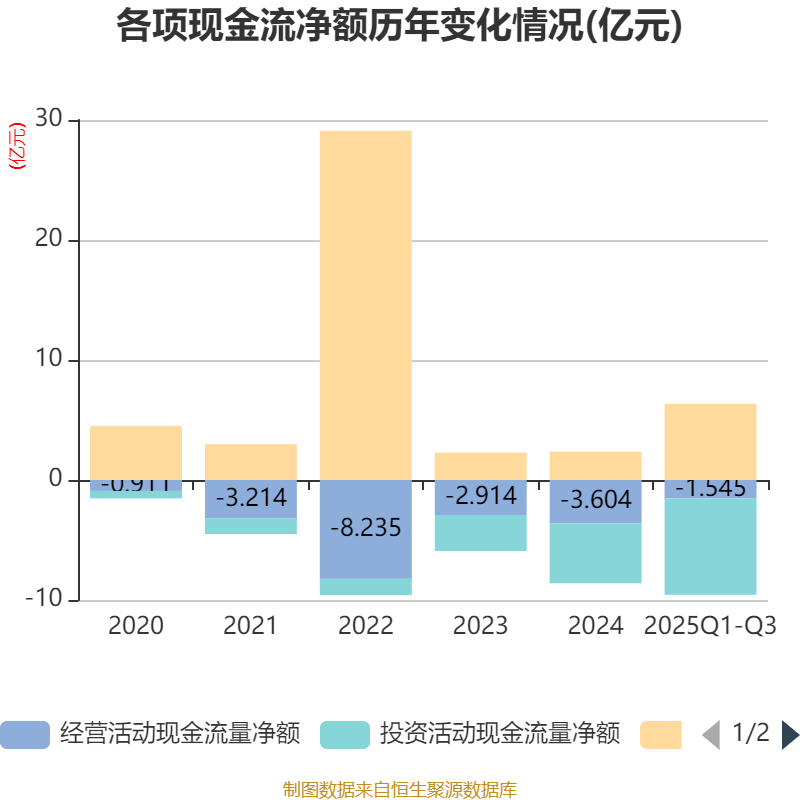 2025年前三季度,公司经营活动现金流净额为-1.55亿元,同比增加8361.7万元;筹资活动现金流净额6.36亿元,同比增加4.16亿元;投资活动现金流净额-8.02亿元,上年同期为-4.08亿元。