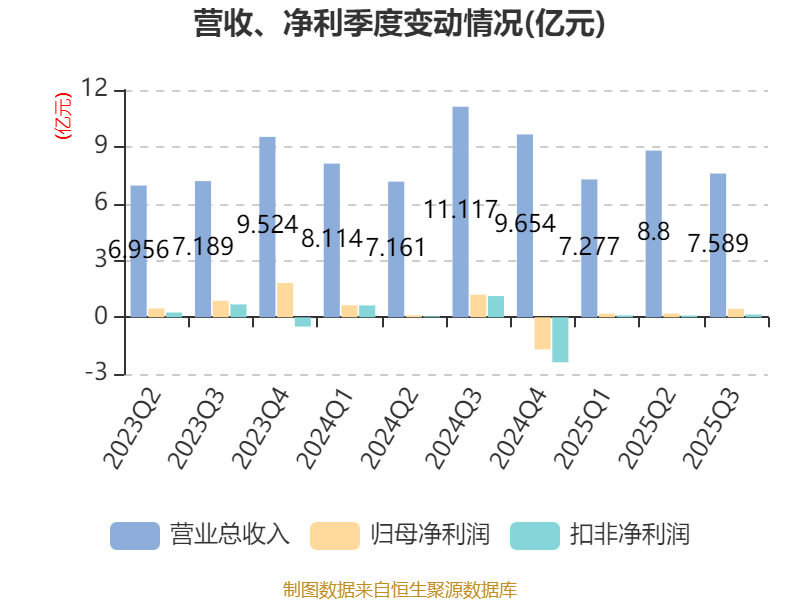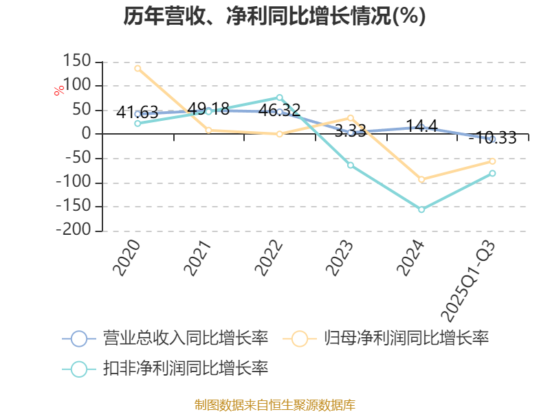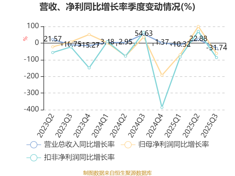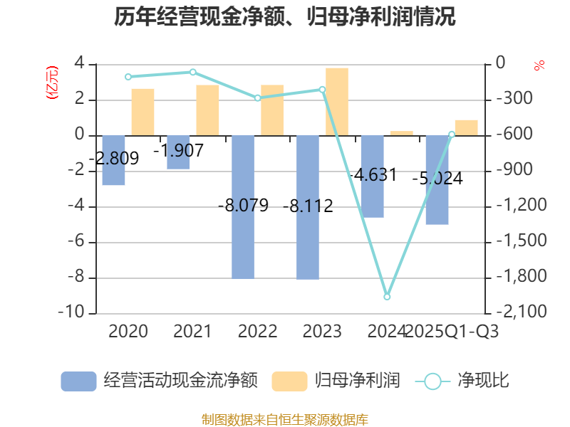 2025年前三季度,公司经营活动现金流净额为-5.02亿元,同比减少7855.98万元;筹资活动现金流净额6.08亿元,同比减少5083.79万元;投资活动现金流净额-1.19亿元,上年同期为-3.66亿元。