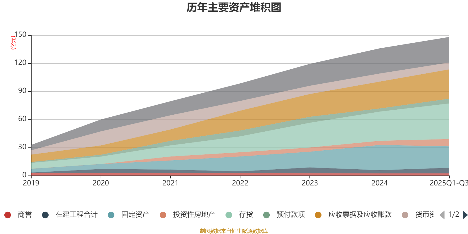 资产重大变化方面,截至2025年三季度末,公司固定资产较上年末减少14.58%,占公司总资产比重下降4.29个百分点;存货较上年末增加21.89%,占公司总资产比重上升2.71个百分点;投资性房地产较上年末增加75.49%,占公司总资产比重上升1.99个百分点;在建工程合计较上年末增加74.04%,占公司总资产比重上升1.5个百分点。