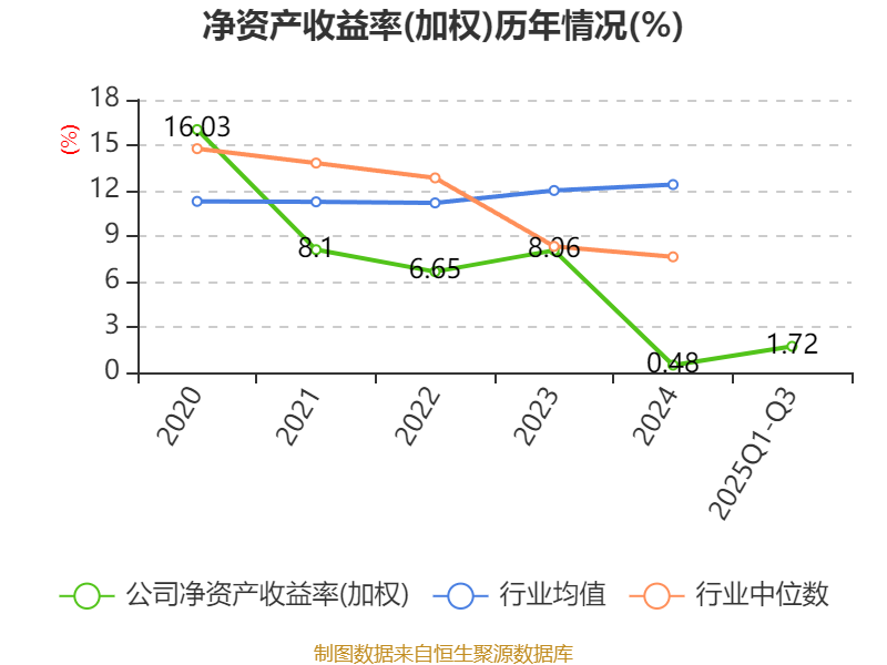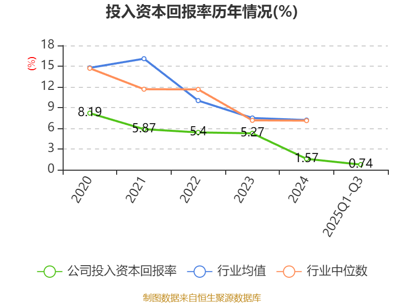盈利能力方面, 2025年前三季度公司加权平均净资产收益率为1.72%,同比下降2.12个百分点。公司2025年前三季度投入资本回报率为0.74%,较上年同期下降1.79个百分点。