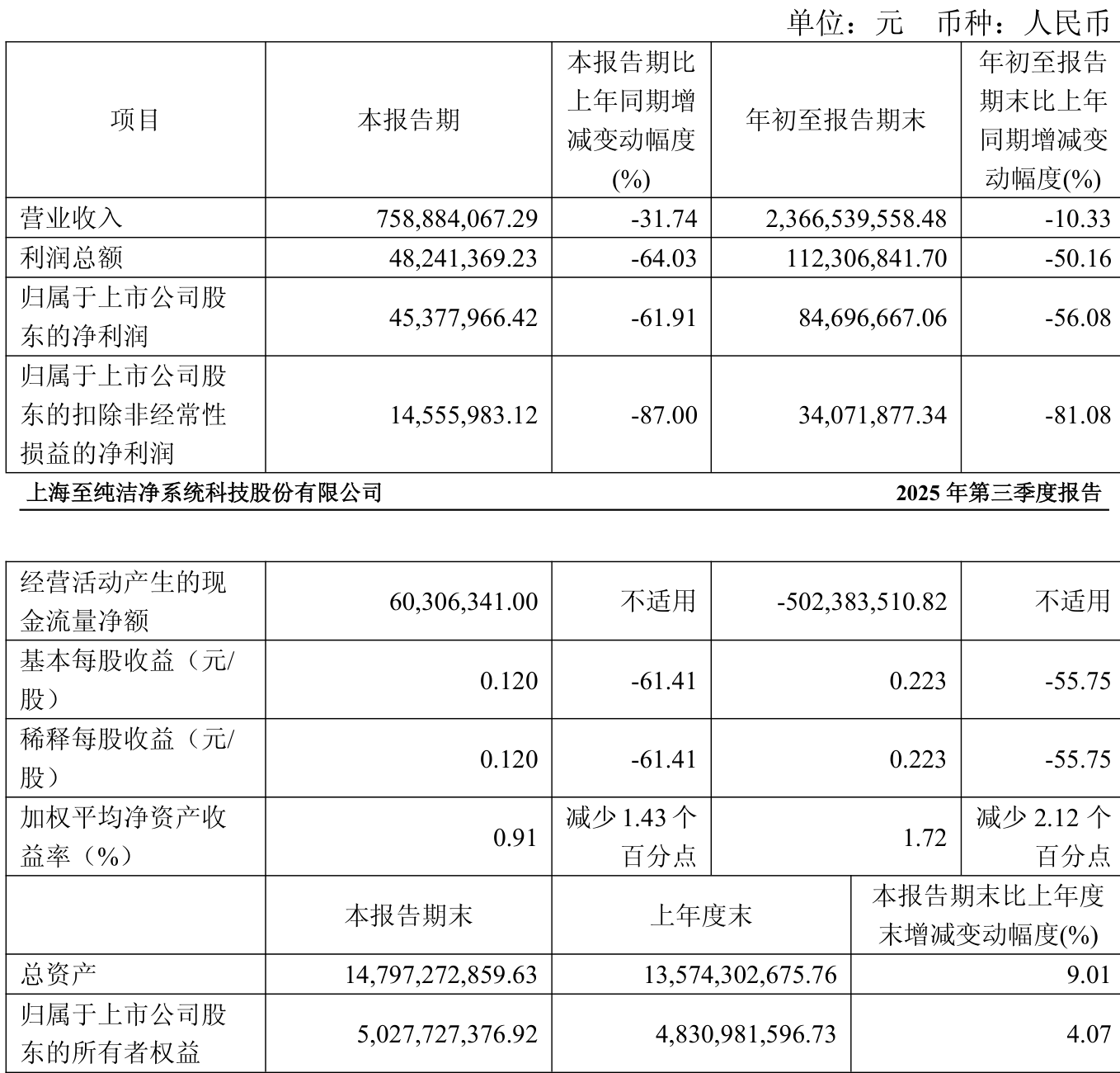 中证智能财讯至纯科技(603690)10月31日披露2025年第三季度报告。前三季度公司实现营业总收入23.67亿元,同比下降10.33%;归母净利润8469.67万元,同比下降56.08%;扣非净利润3407.19万元,同比下降81.08%;经营活动产生的现金流量净额为-5.02亿元,上年同期为-4.24亿元;报告期内,至纯科技基本每股收益为0.223元,加权平均净资产收益率为1.72%。