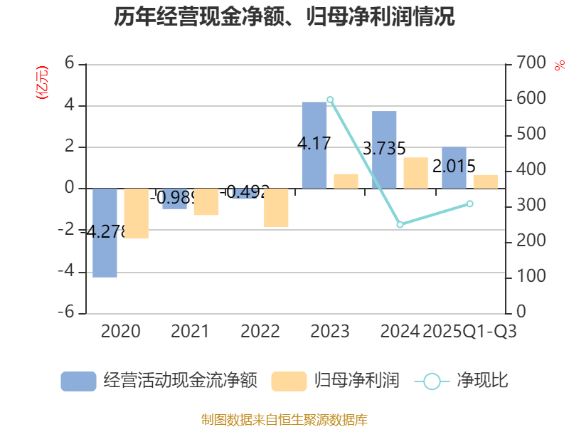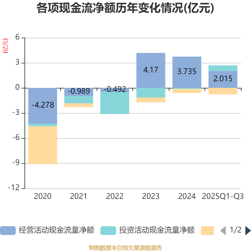 2025年前三季度,公司经营活动现金流净额为2.02亿元,同比下降32.79%;筹资活动现金流净额-7755.1万元,同比减少5412.7万元;投资活动现金流净额6793.62万元,上年同期为2001.43万元。