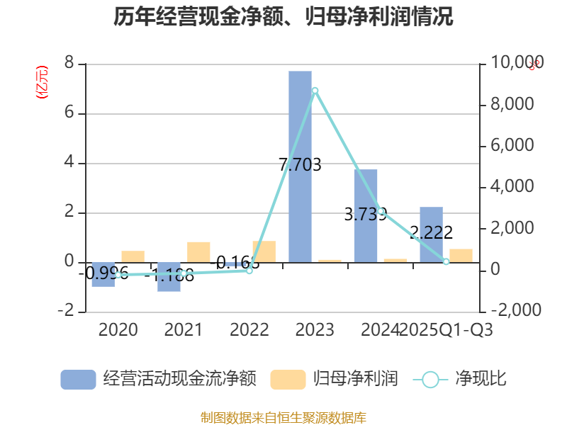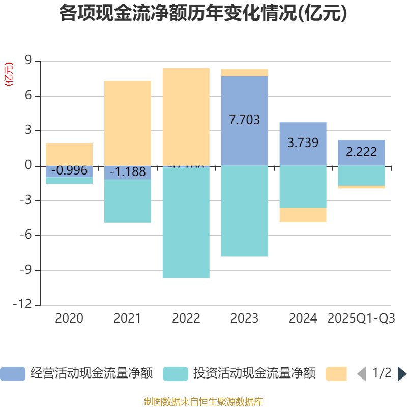 2025年前三季度,公司经营活动现金流净额为2.22亿元,同比增长145.63%;筹资活动现金流净额-2386.01万元,同比增加3395.15万元;投资活动现金流净额-1.72亿元,上年同期为-1.63亿元。