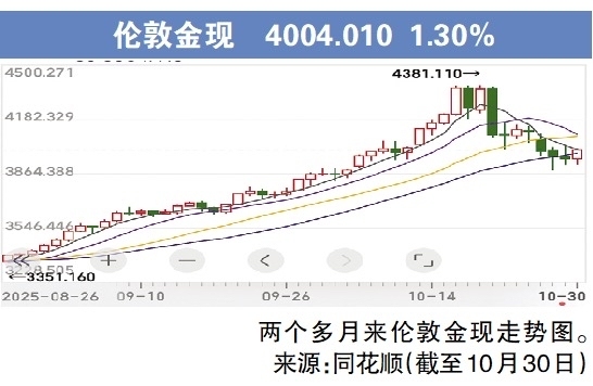 10月30日现货黄金“反弹”止跌回升至4000美元/盎司关口,伦敦金现高位触及4011.44美元/盎司,日内涨超1.4%,扭转了此前连续四日的下行趋势。国内方面,截至10月30日收盘,沪金日内上涨0.82%。