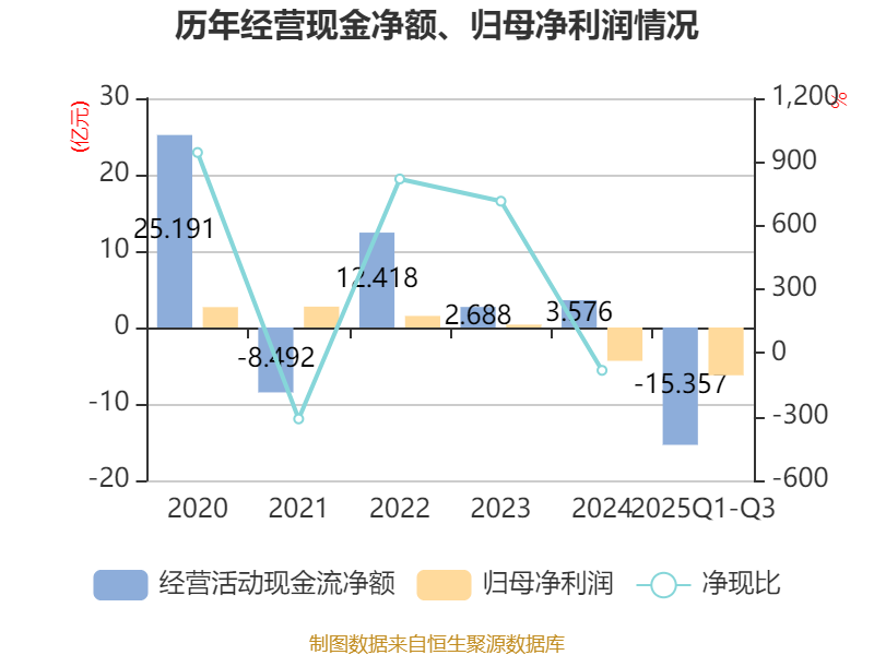 2025年前三季度,公司经营活动现金流净额为-15.36亿元,同比减少3.35亿元;筹资活动现金流净额-7.51亿元,同比减少8.39亿元;投资活动现金流净额4.52亿元,上年同期为-3.05亿元。